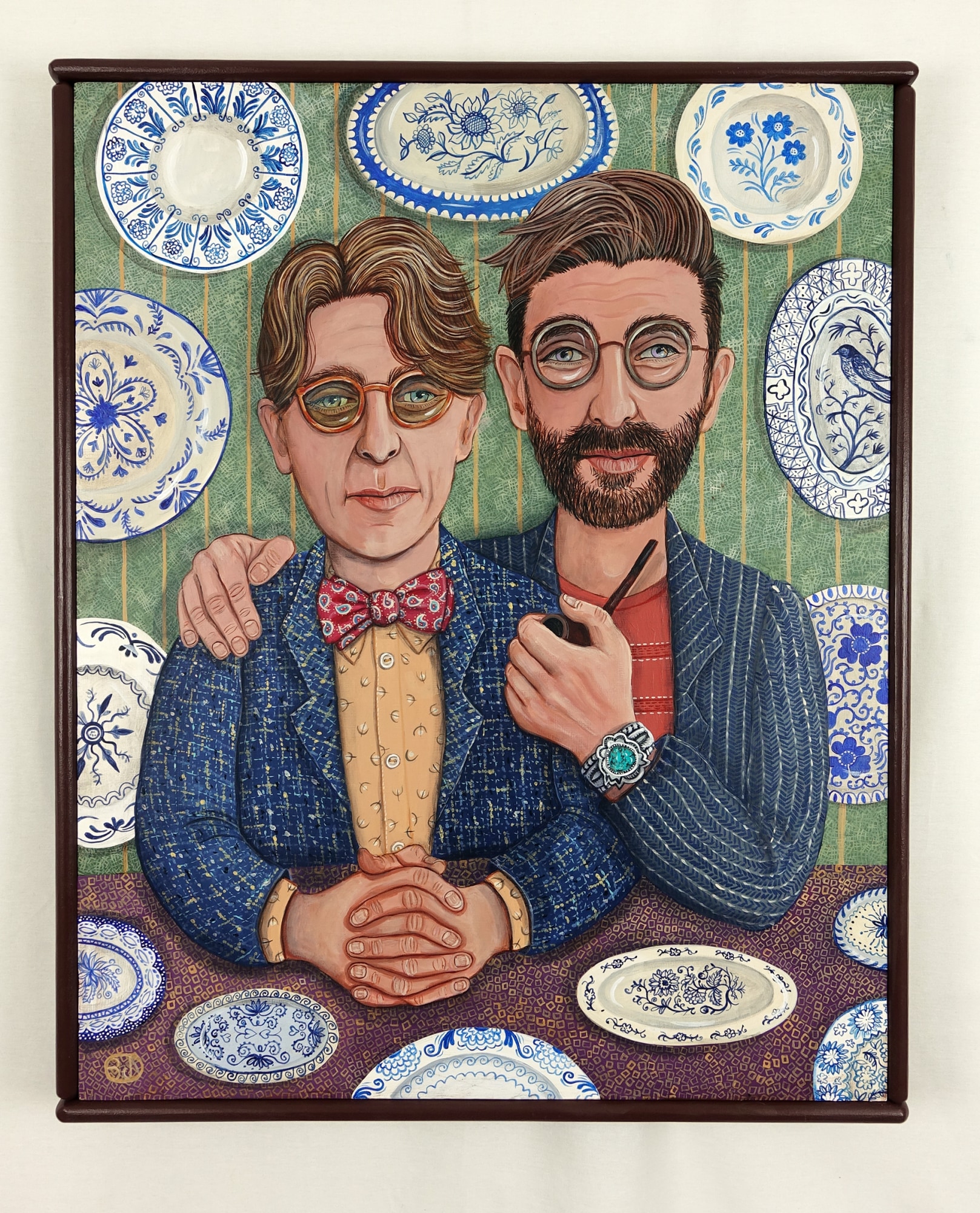 This is a gay couple presented amidst their collection of blue and white china.