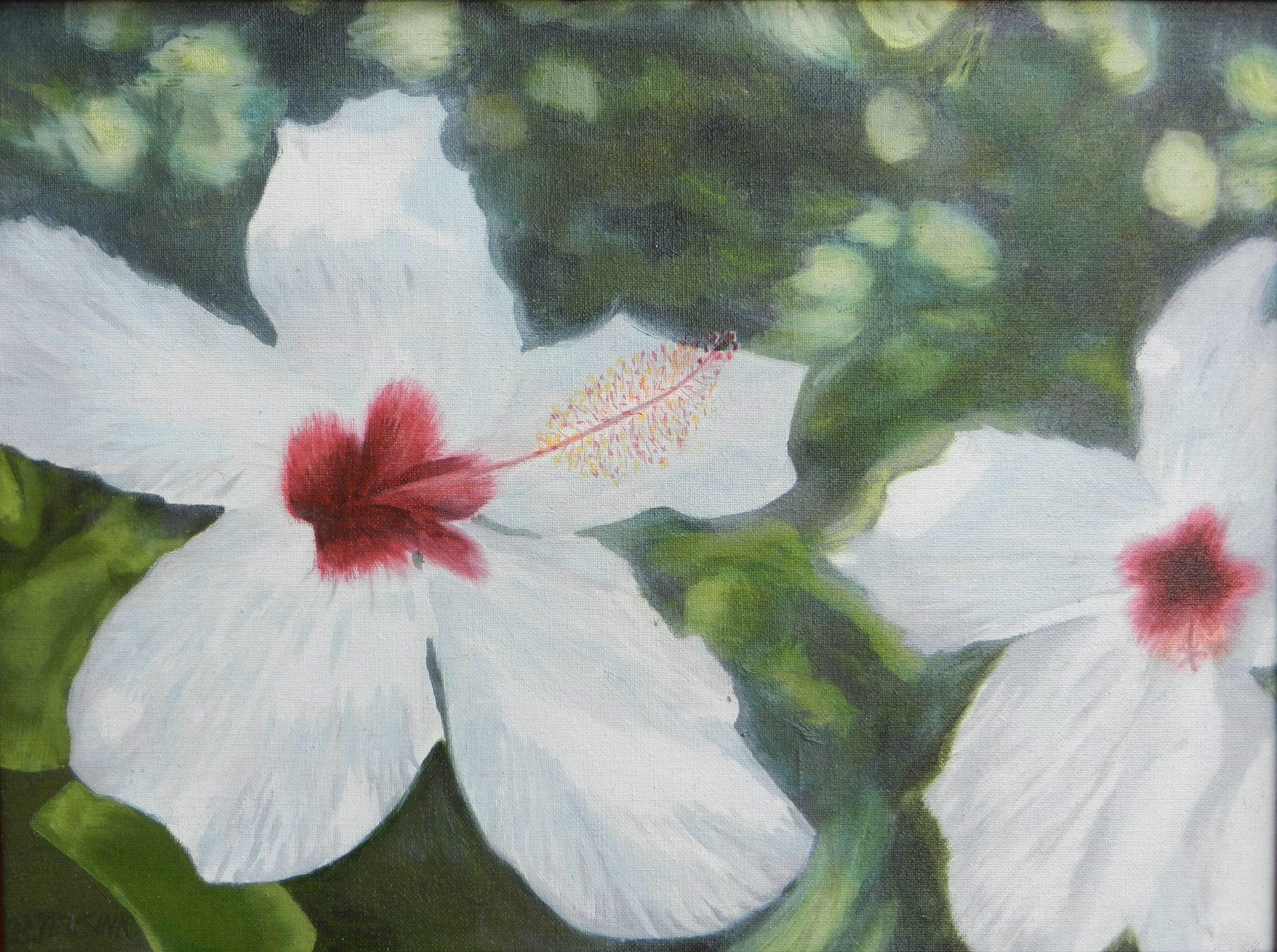 Two white hibiscus blooms on green foliage.