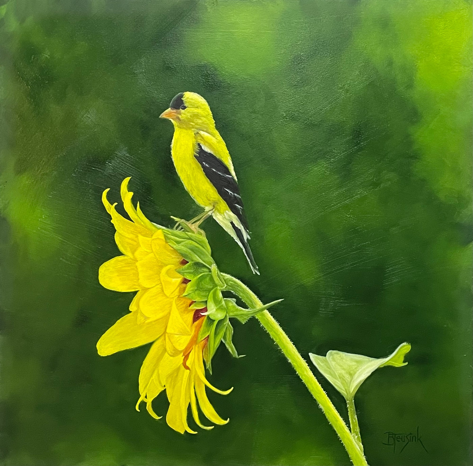 The brilliant golden hues of the Goldfinch seemed perfect to be paired with the bright sunny head of a sunflower.