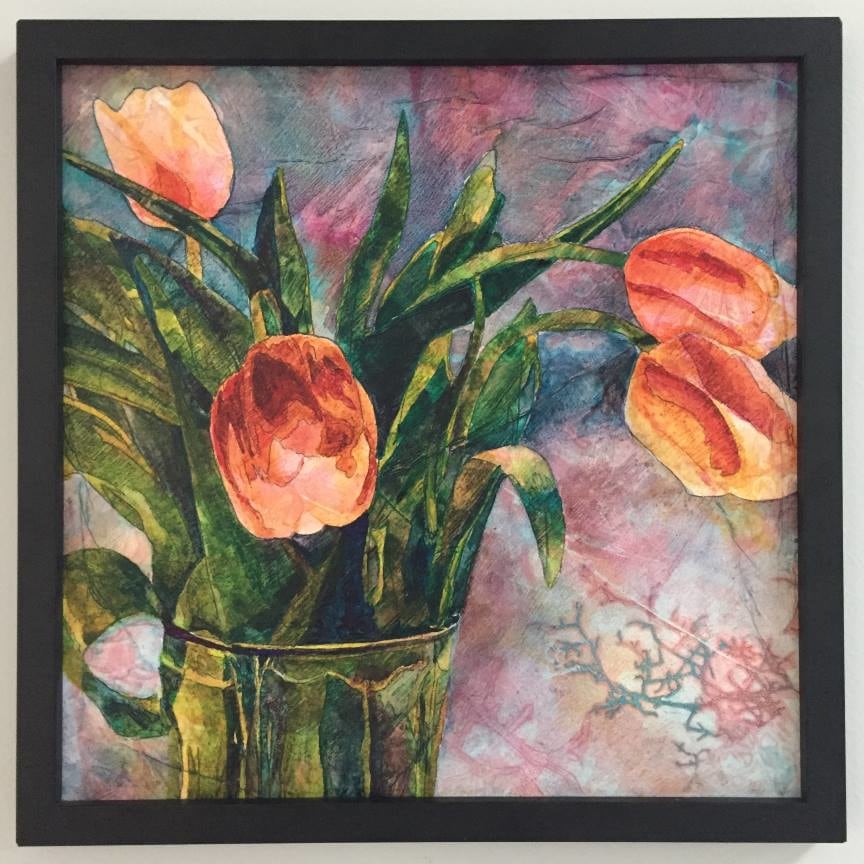 A colorful vase of richly colored tulips in a glass vase on top of a textured multihued background.