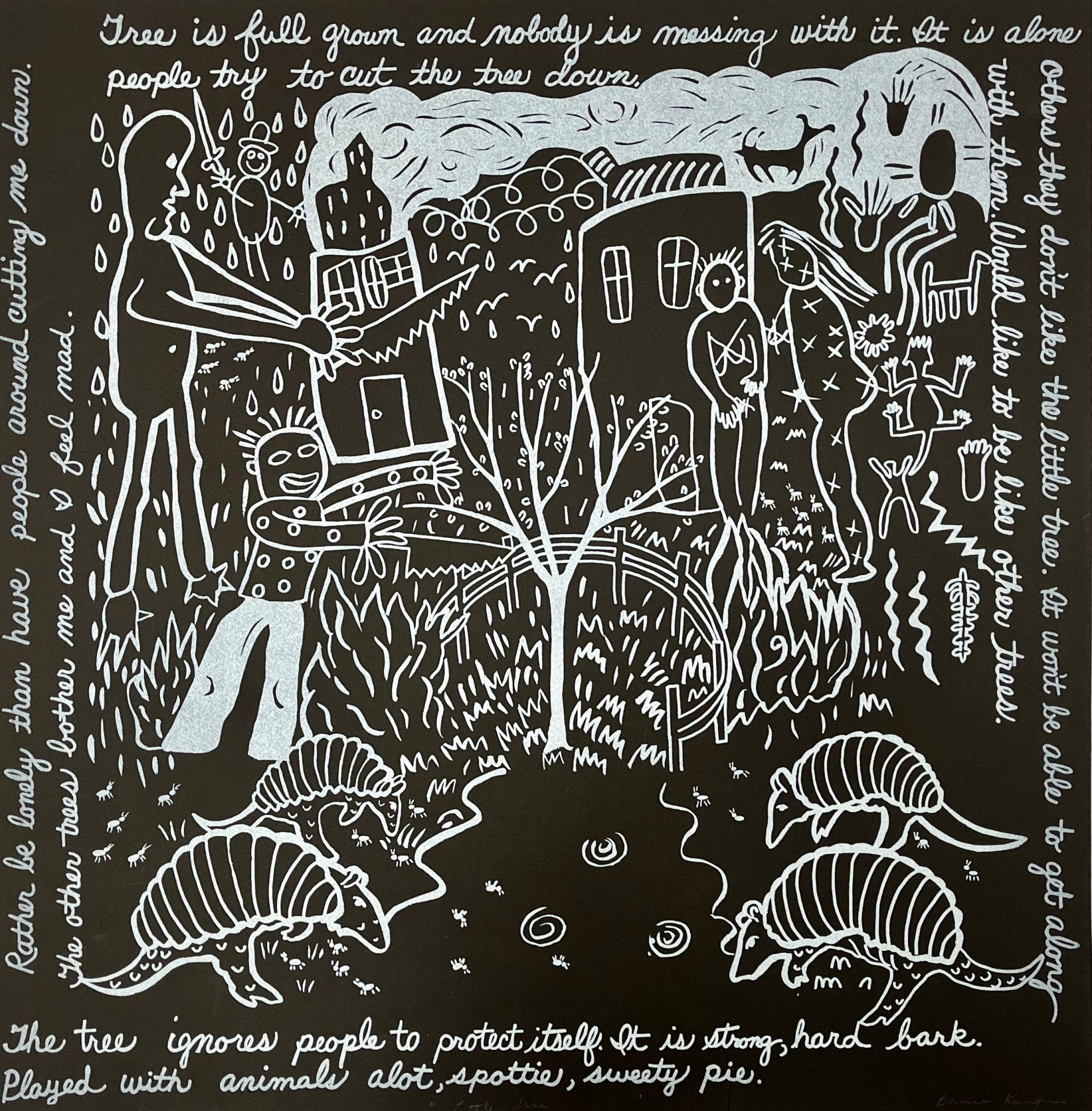 Around the edge are therapy notes given to me by a young art therapy client. This described her sexual abuse and how she was trying to grow in spite of it, in the center is a tree trying to grow, the title Spottie, Sweety Pie were the names of her dogs, which gave her comfort. Surrounding tree are people with saws trying to cut the tree down, but the tree is growing in a lush green area with a white fence in spite of the harm around it.