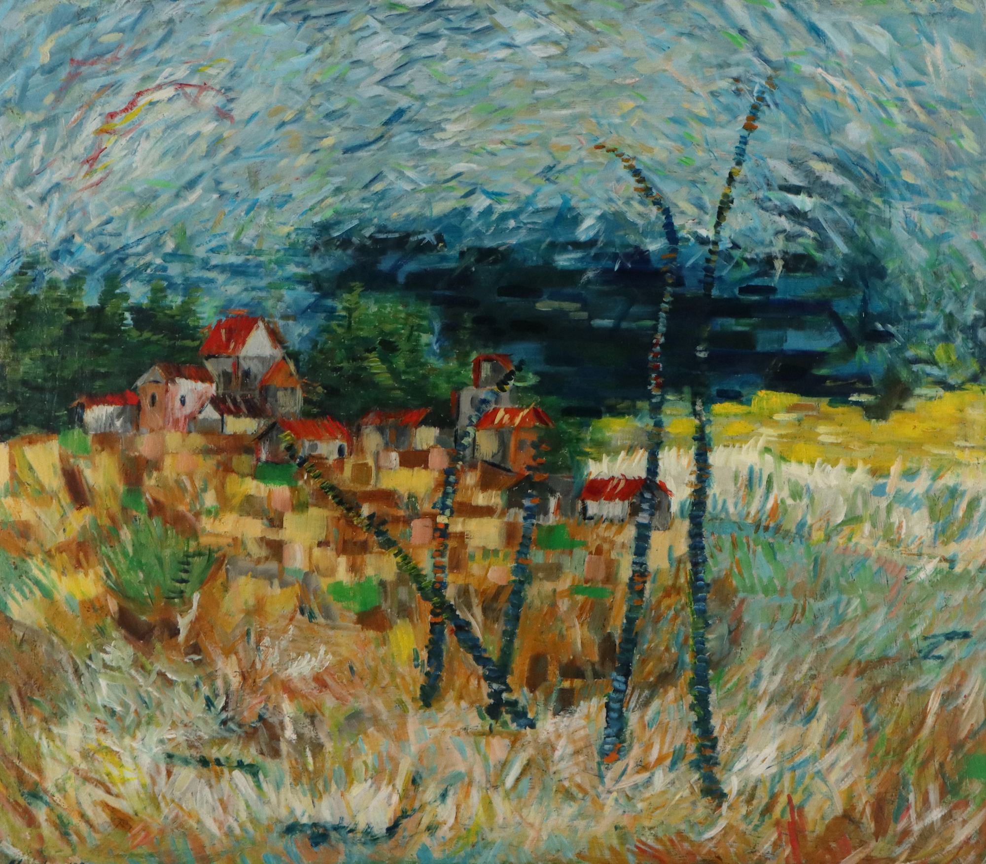 Painting, oil on board, landscape, houses, sky, brush marks, field, movement. Framed.