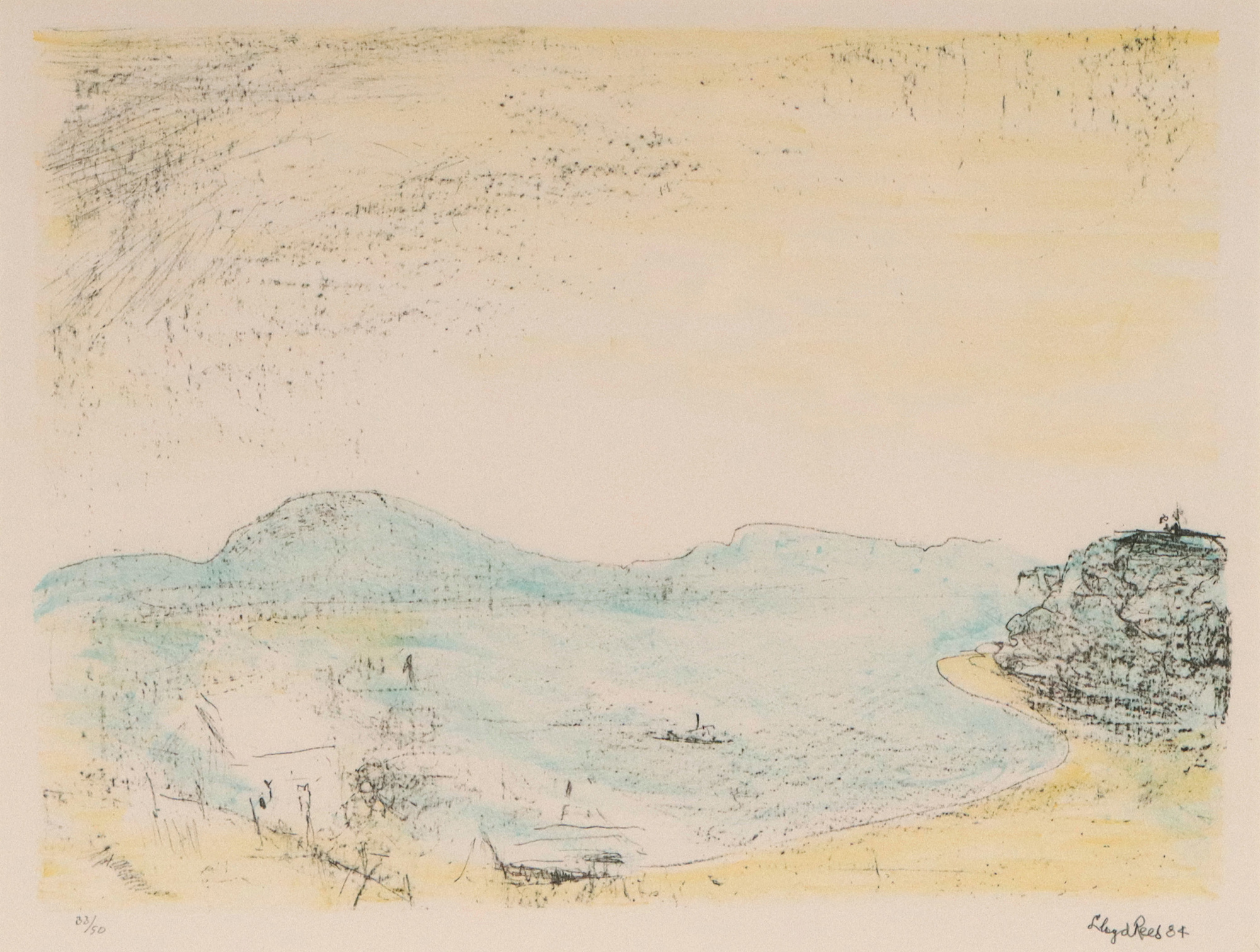 Print, lithograph on paper, sketch, seascape, sand, ocean, cliff face, sky. Framed.