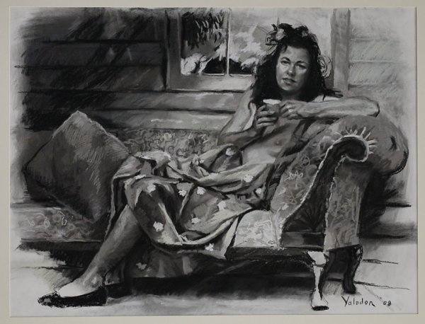 Pastel on Stonehenge paper, Image of Genevieve Moseley on Hill End verandah drinking tea. Matted.