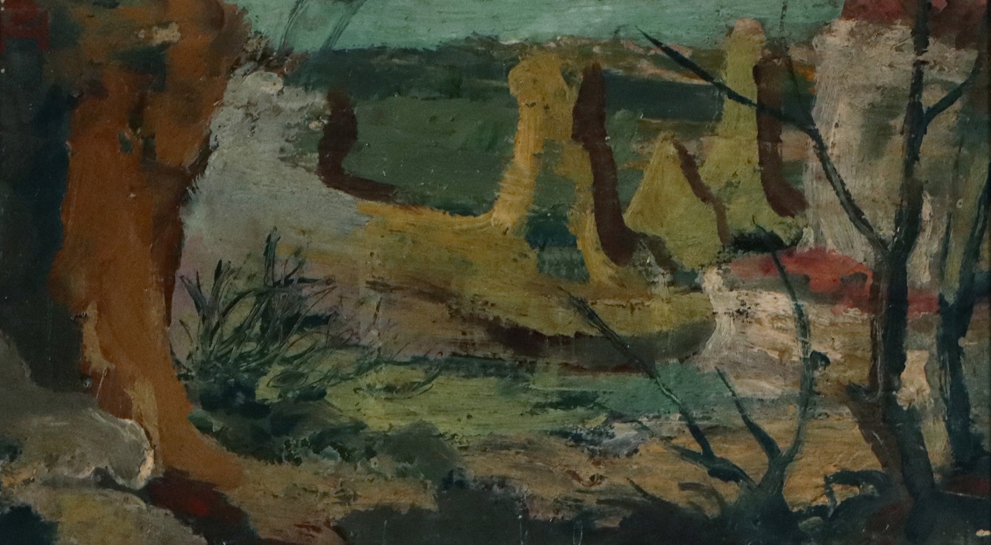 Painting, oil on board, Small landscape of Golden Gully, Hill End NSW. Eroded gully, Bush, ruins, creek, trees, structure. Impression, Framed in white timber.