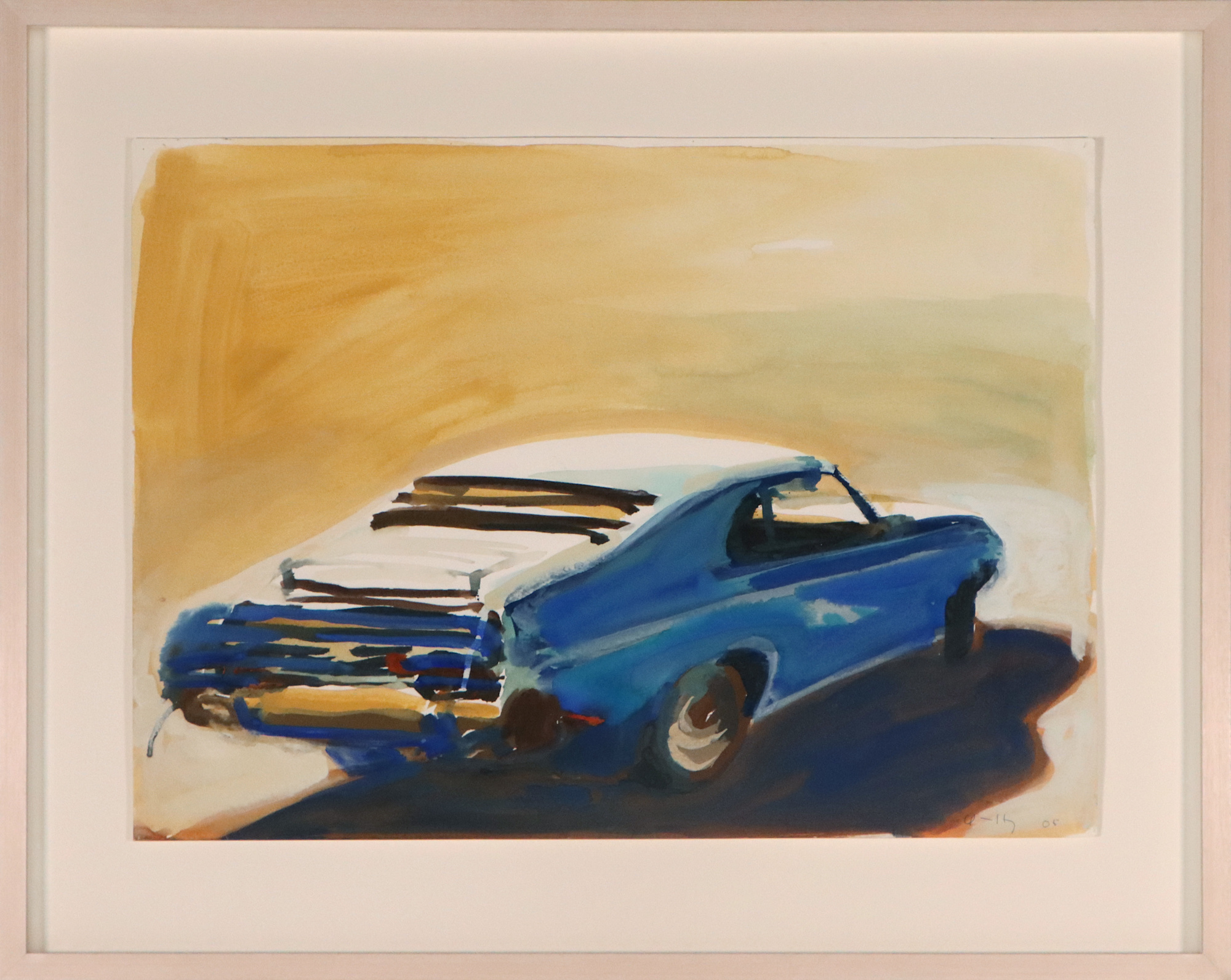 Painting, gouache on paper, car, blue, shadow, landscape, Hill End, Hill End Artist in Residency, Ford XA Falcon. Framed.