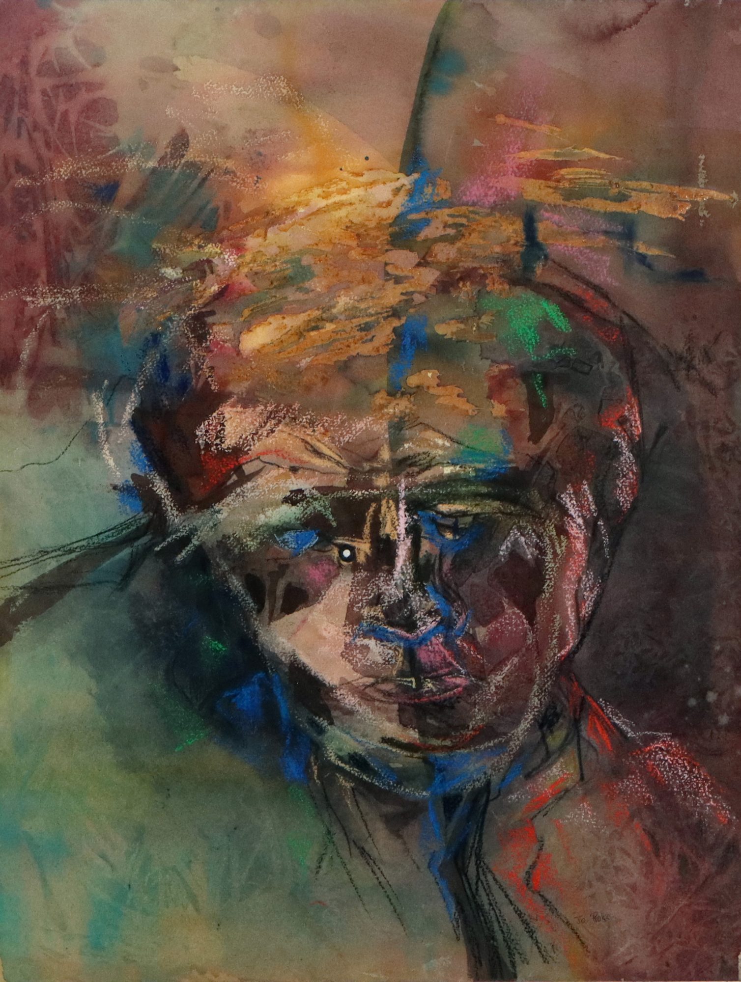 Painting, oilstick and watercolour on paper, abstract portrait of unknown head or face. In red, green, blue and yellow. Framed