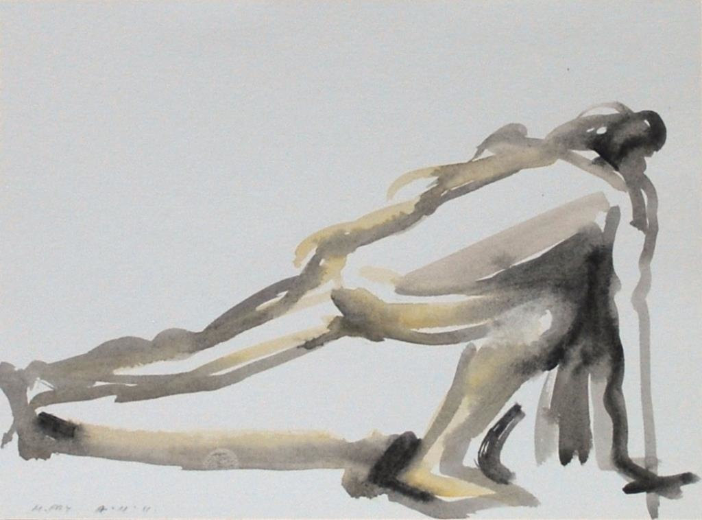 Male Life drawing, water colour on paper. Male nude, one leg stretched out behind him, hands on ground in front of him.