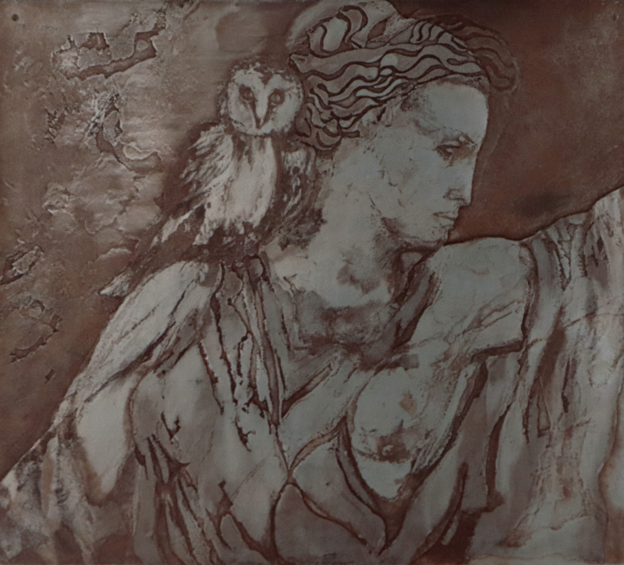 Plate, zinc, Minerva, Roman goddess, owl, female. Framed.