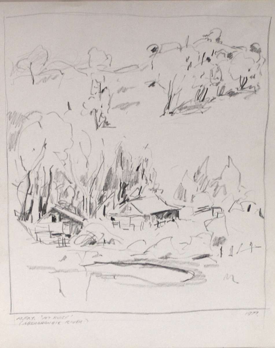 Pencil drawing on cartridge paper. Landscape with Mud house, pond and trees, hills in background