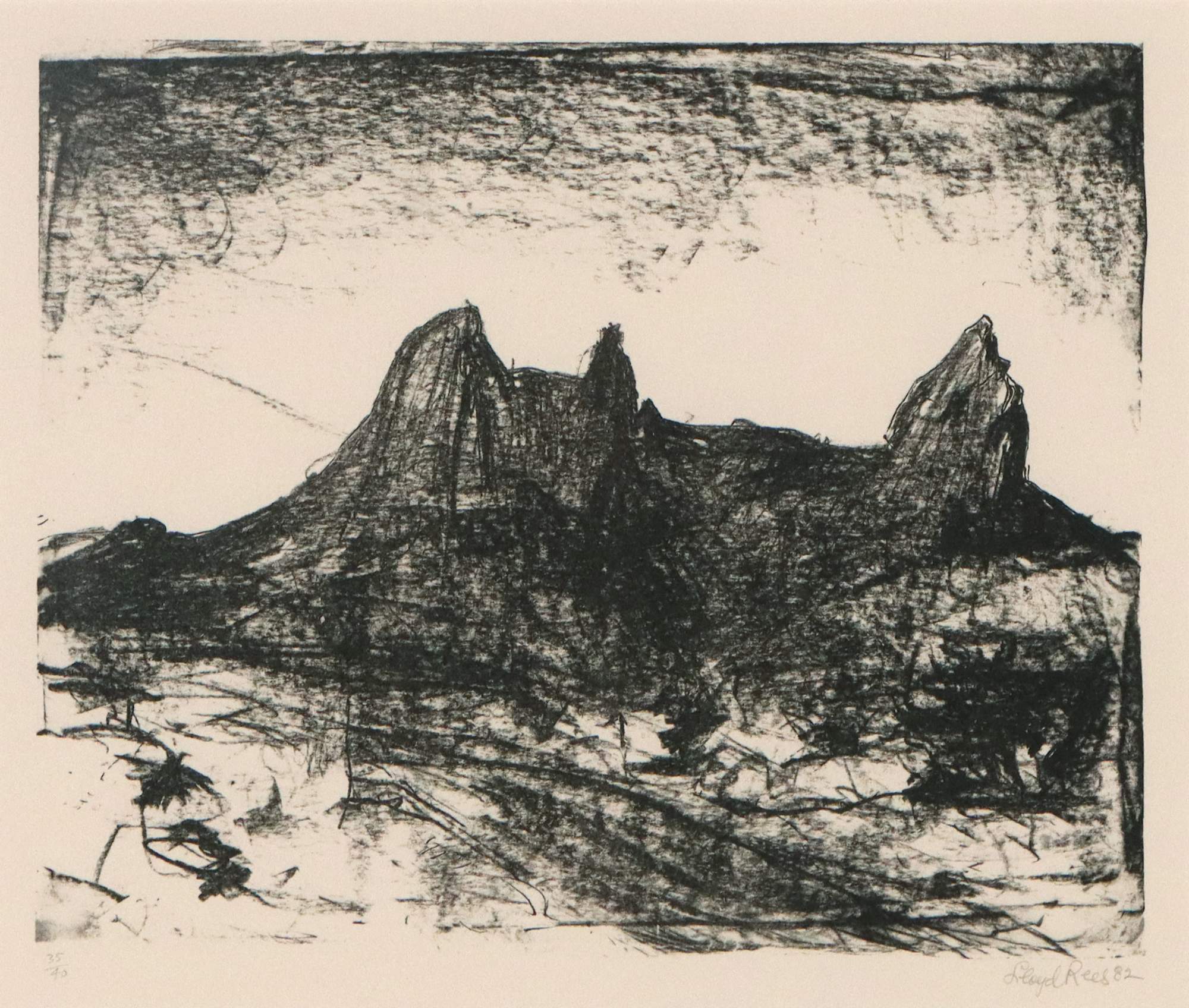 Print, lithograph on paper, landscape, sketch, mountains, sky, black and white. Framed.