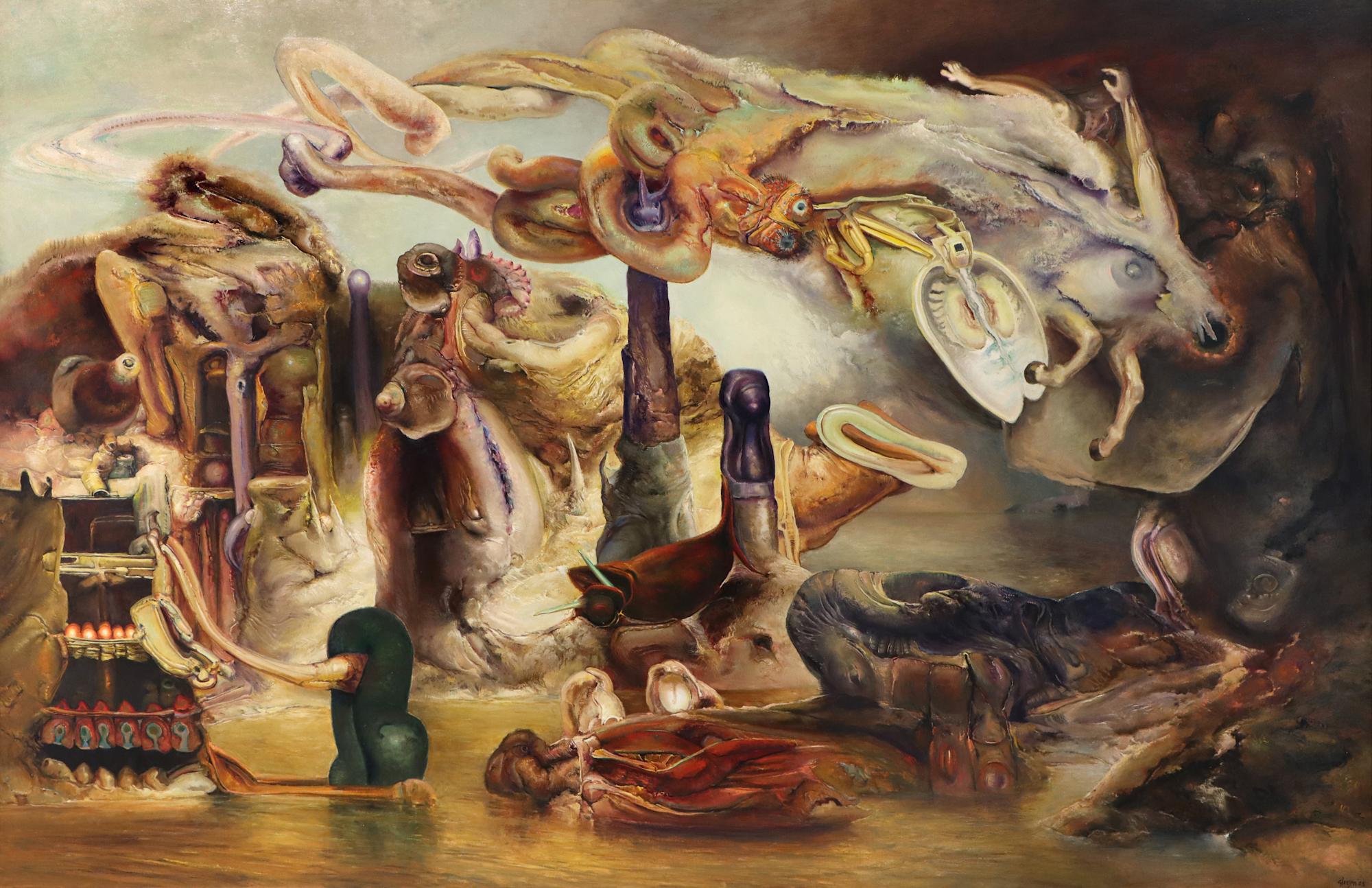 Painting, oil on canvas, flesh, organs, surreal, nightmare, shadow, body parts, innards, insect, arms, legs, hooves, crustaion, eyes. Framed.
