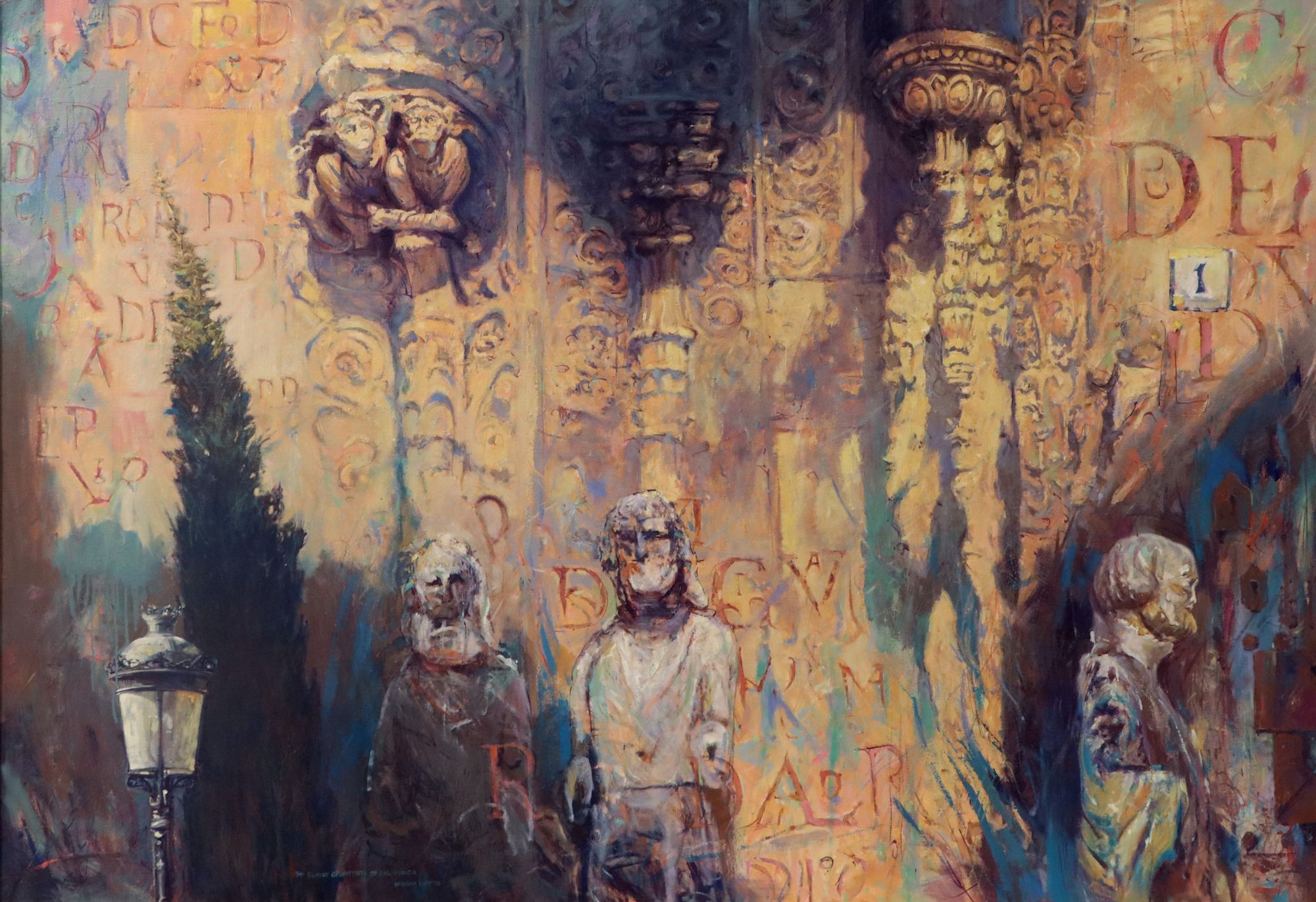 architecture, cathedral exterior, letters, graffiti, street lamp, tree, light, Salamanca cathedral, Spain, gothic architecture, figures, sculpture, goblins