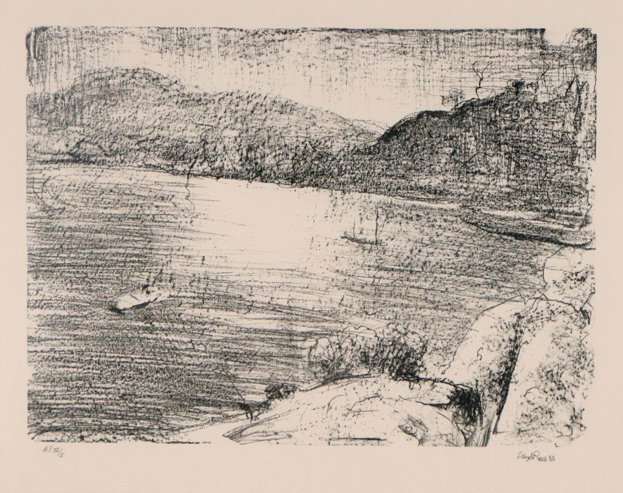 Print, lithograph on paper, sketch, shading, landscape, boat, coast, cliff, rock, tree. Framed.