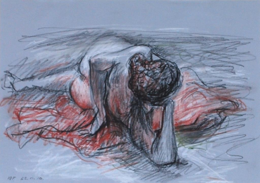 Life Drawing of a nude lying on side, arm propping head up, Carbothello Chalk pencil on coloured paper.