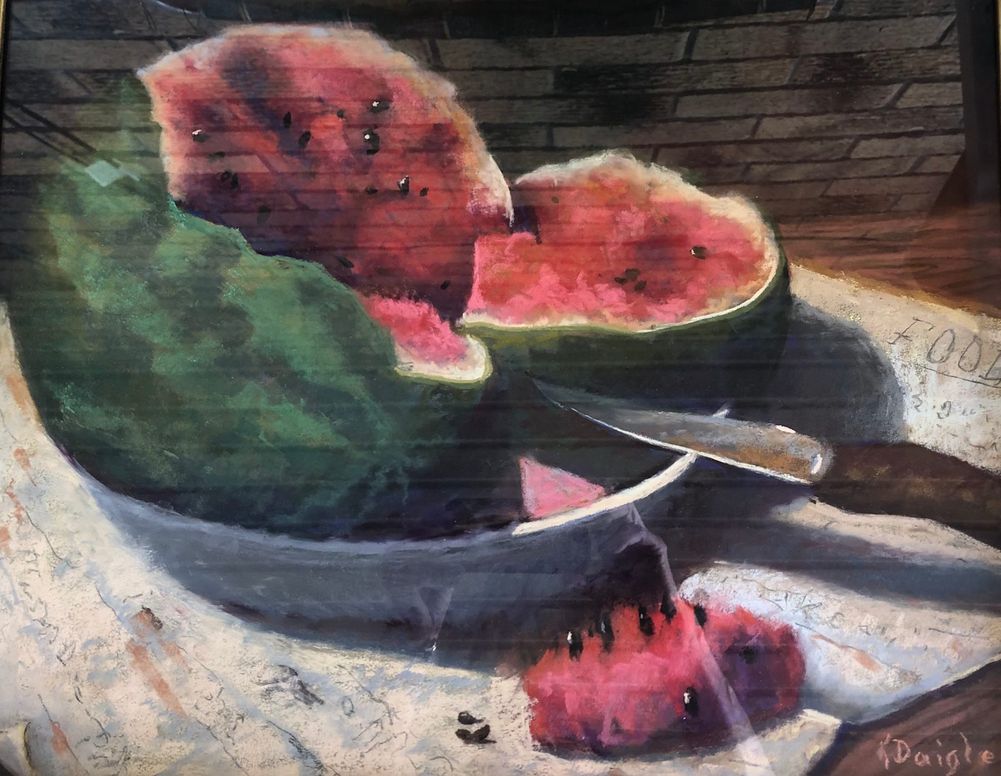 Juicy Sweet is a pastel done outside to have strong shadows. At times, watermelon is served on a table with newspaper.