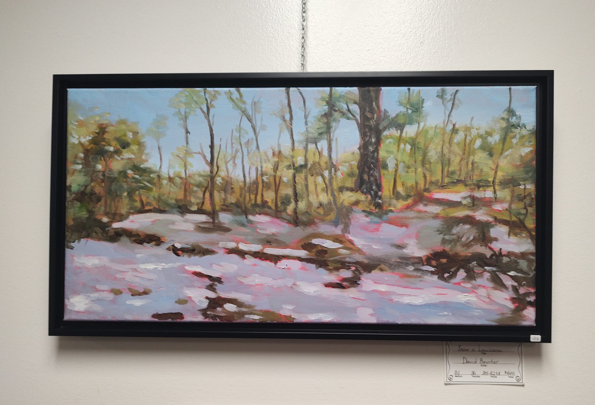 A rare snowfall in Satsuma, Louisiana is the basis for this painting, enhanced with Mardi Gras colors by the warm winter sun. Oil on stretched canvas, with floating frame.