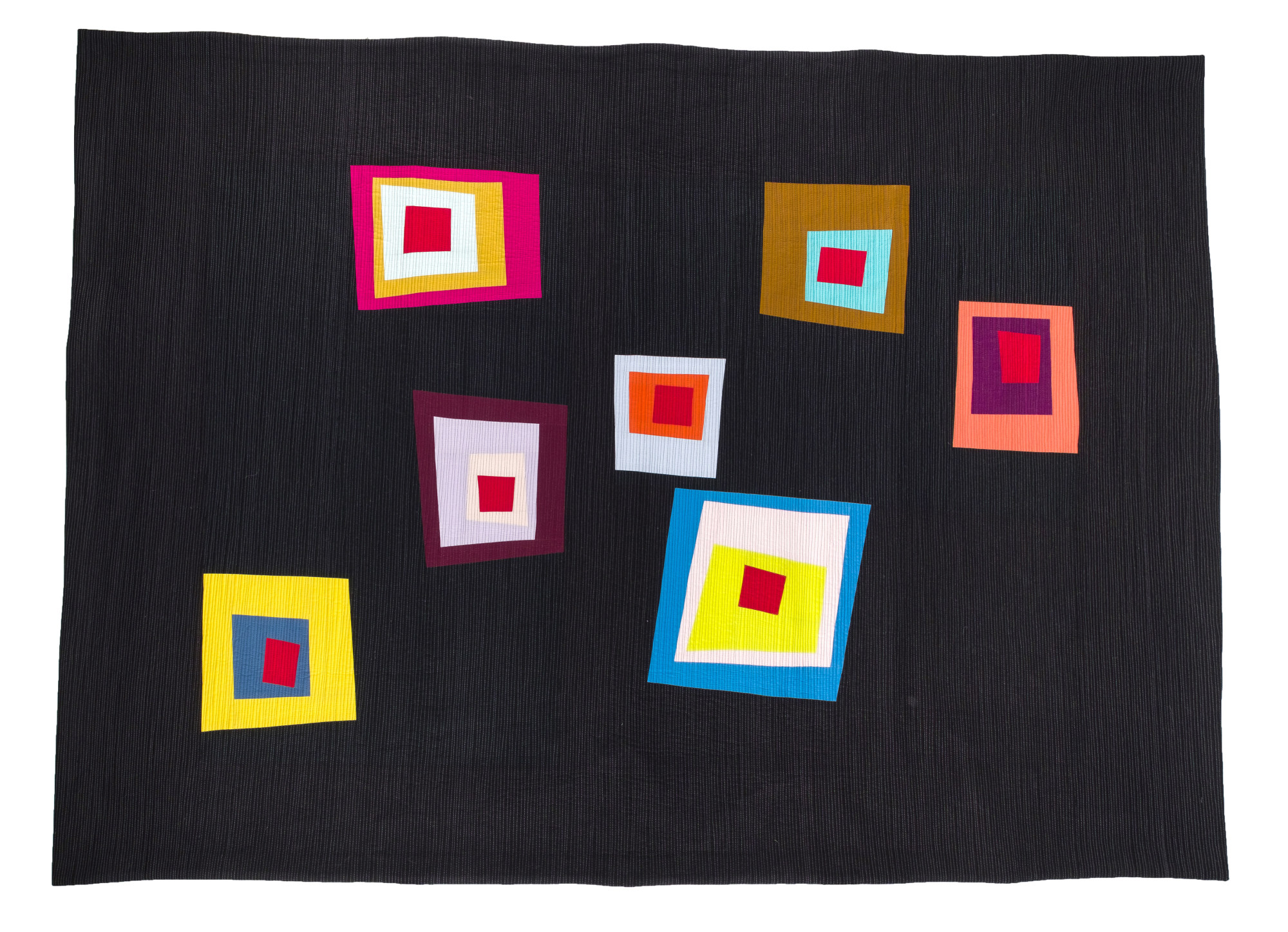 "Social Distance" is part of a large collection of work, originally exhibited in my solo show, "Home," at the Evelyn Peeler Peacock Gallery in Corning, NY. In this show, I explored the concept of "home," in modern society through the improvisational re-imagination of the iconic Log Cabin quilt block. The presence or absence of the traditional red center, representing the hearth fire or the warmth of the home, tells the story of each piece in this collection.