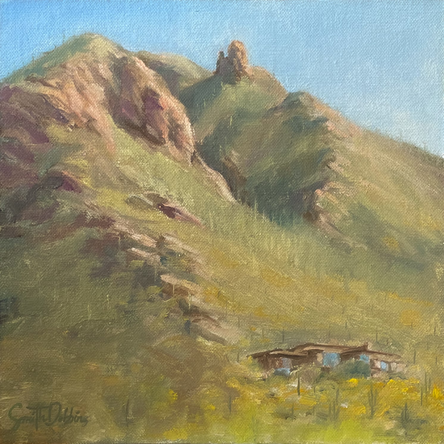This very cool Frank Lloyd Wright-like house (zoom in) caught my eye while painting with fellow painters. Not the typical adobe style yet blended nicely with the landscape and made for a fun composition.
