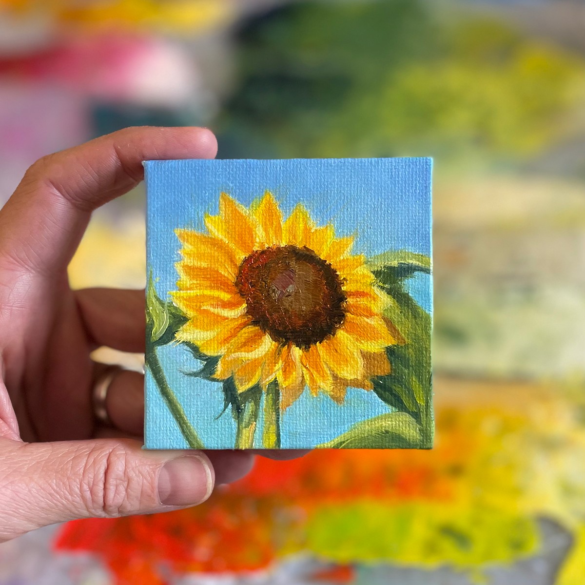 This tiny canvas shines brightly with a mini sunflower.