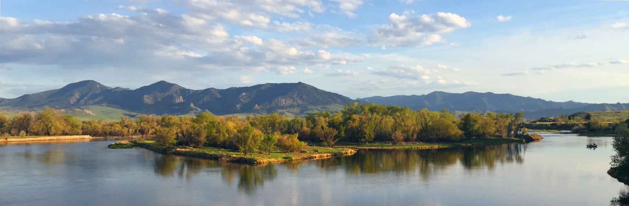 A framed mounted photograph of the tranquil panoramic view of the Missouri River in the glow of late summer, with fishing boats quietly drifting into Cascade at dusk.