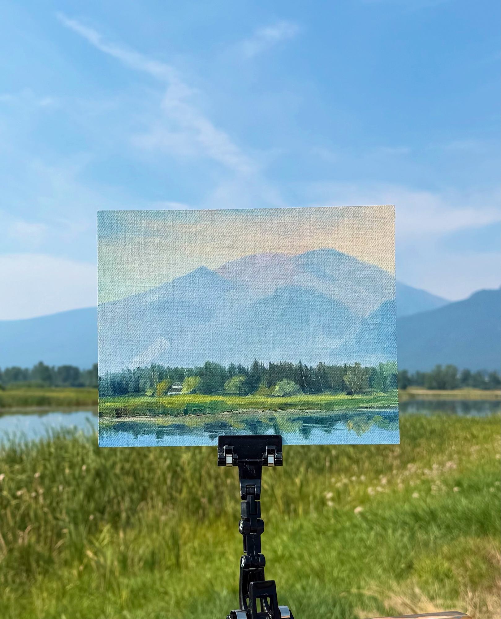 Painted on site at Lee Metcalf Wildlife Refuge — the barn, the water, the mountains. When I held it up, the painting and the landscape clicked into place like they belonged together. It’s fun when that happens.