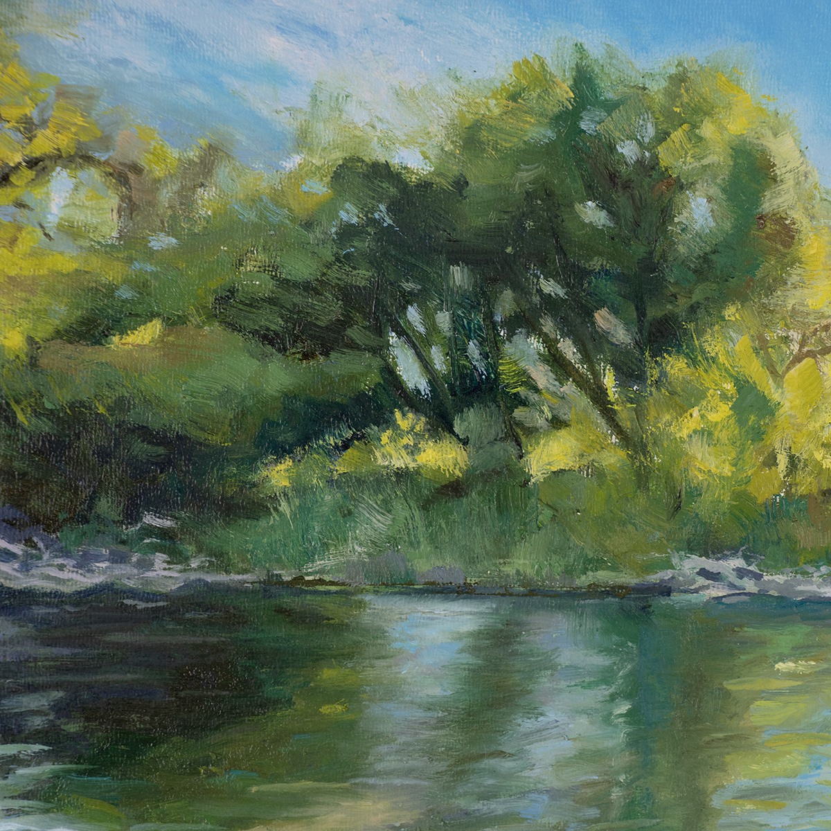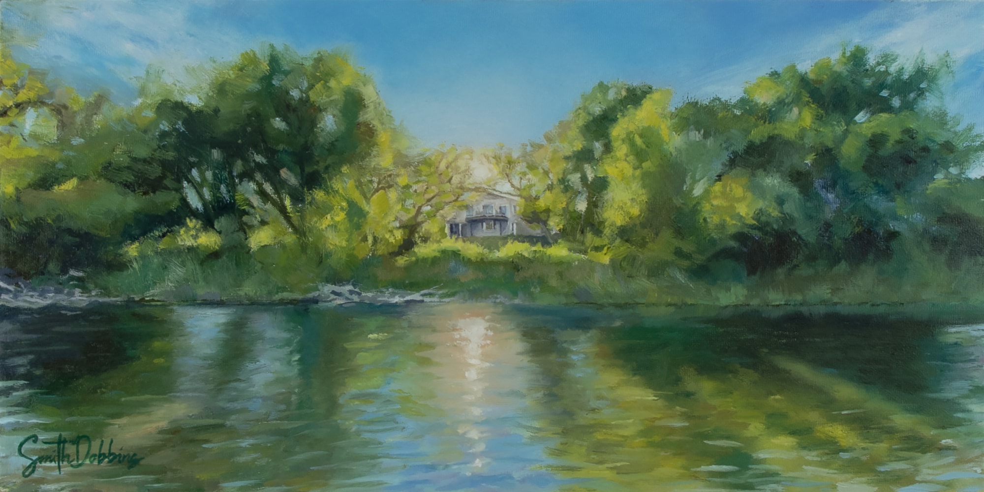 Newly finished commission of the beautiful Missouri River. This customer has a gorgeous family property. The quest was to have the house peeking through the trees and capture those colorful reflections. It took some wading across the river but I was able to get a great evening reference shot and go from there.