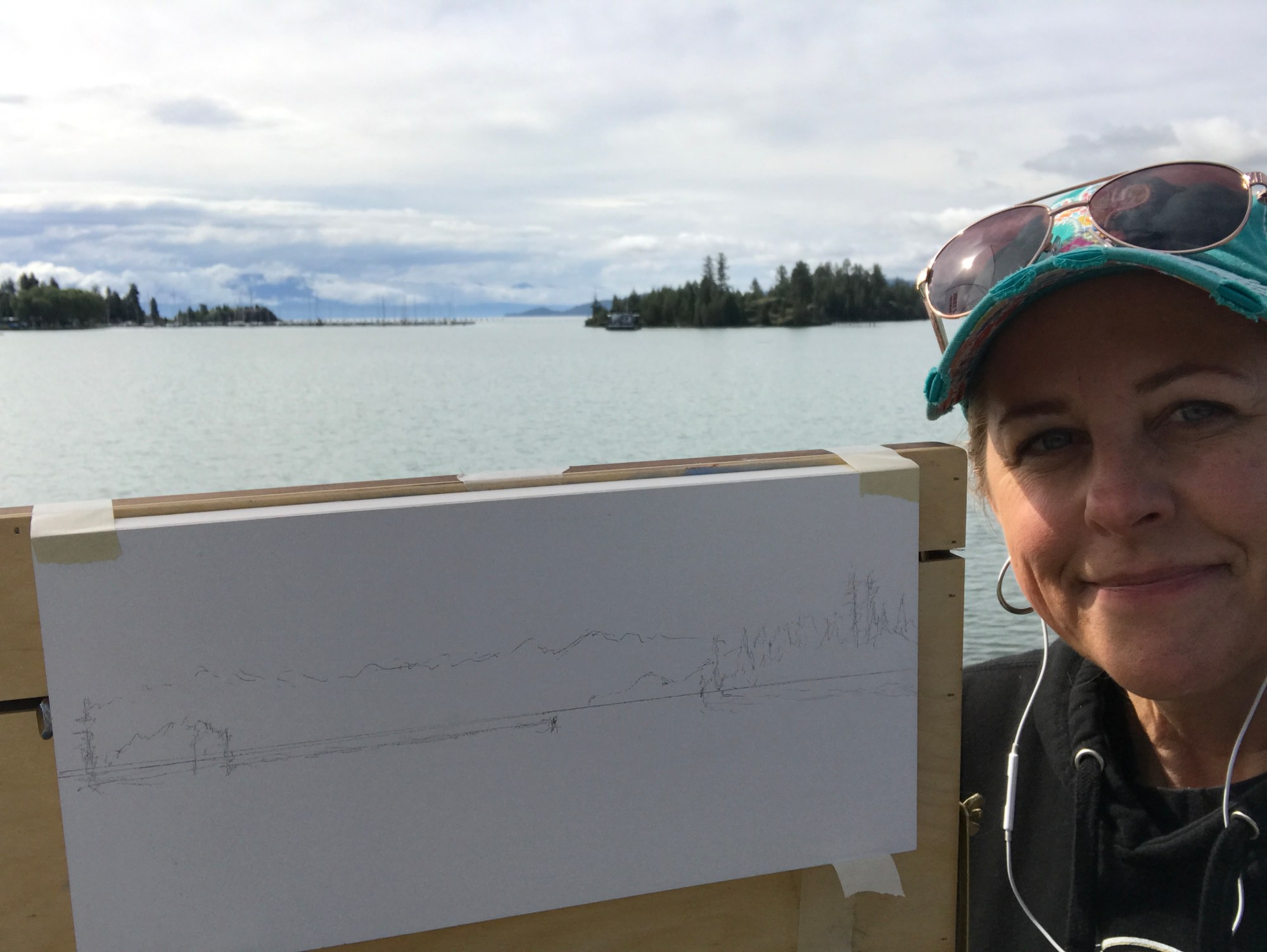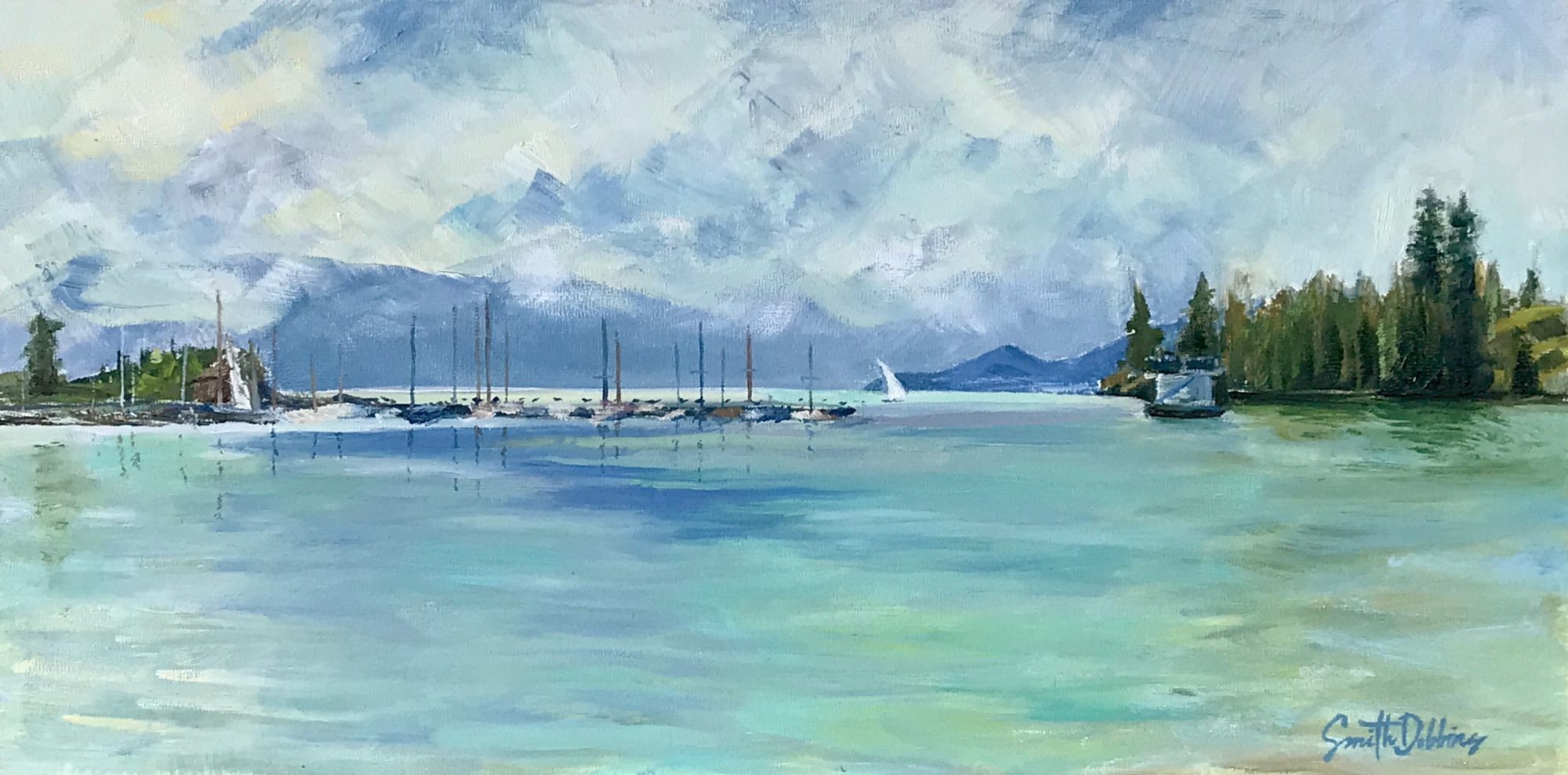 Somers is a charming little lakeside town located on the north shore of Flathead Lake, MT. My husband and I traveled around the Flathead Valley for a week while I participated in the Plein Air Glacier 2020 event through the Hockaday Museum in Kalispell, MT. Since much of Glacier Park was closed due to covid, the next best subject was Flathead Lake and sailboats, this scene being the North Flathead Yacht Club. I painted this painting on two separate mornings, as lighting from changing weather conditions quickly changed what I had started. When I was finishing the painting on the second morning, a sailboat set sail into the horizon for perfect timing to include in the painting.