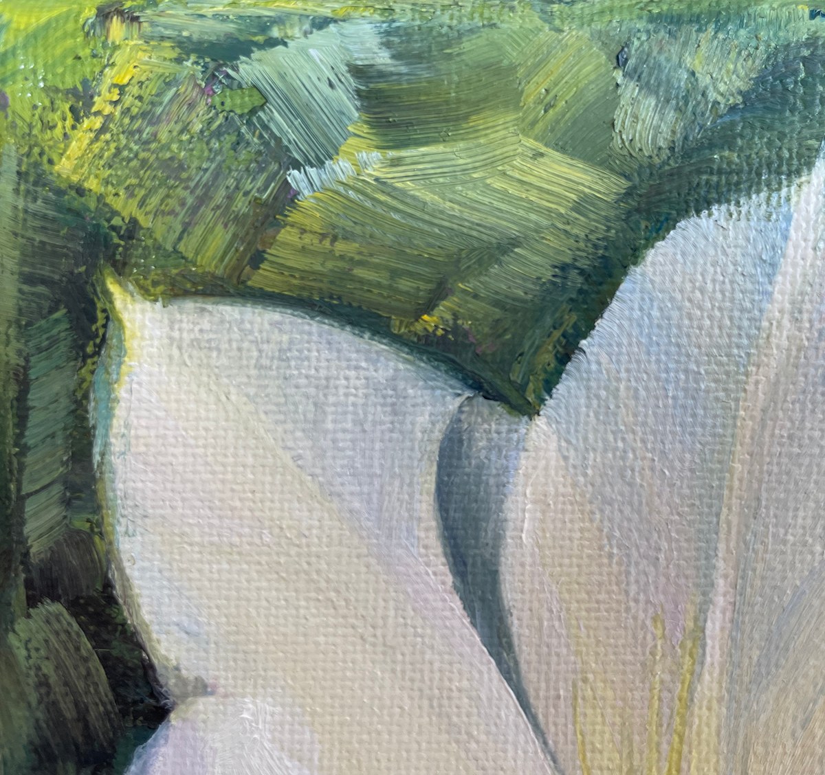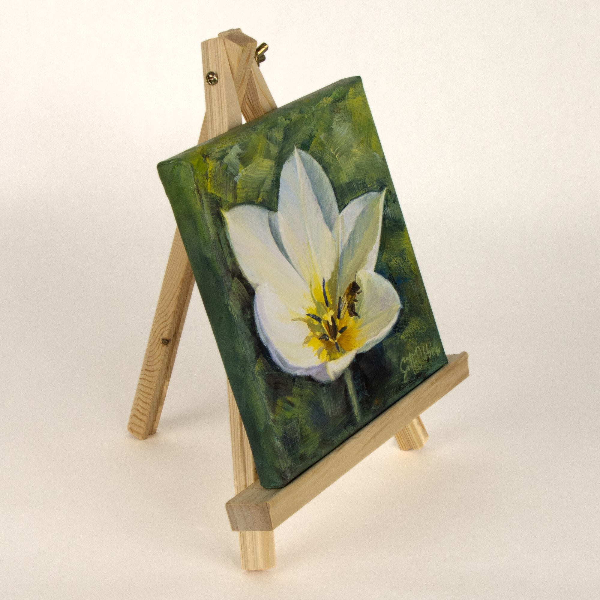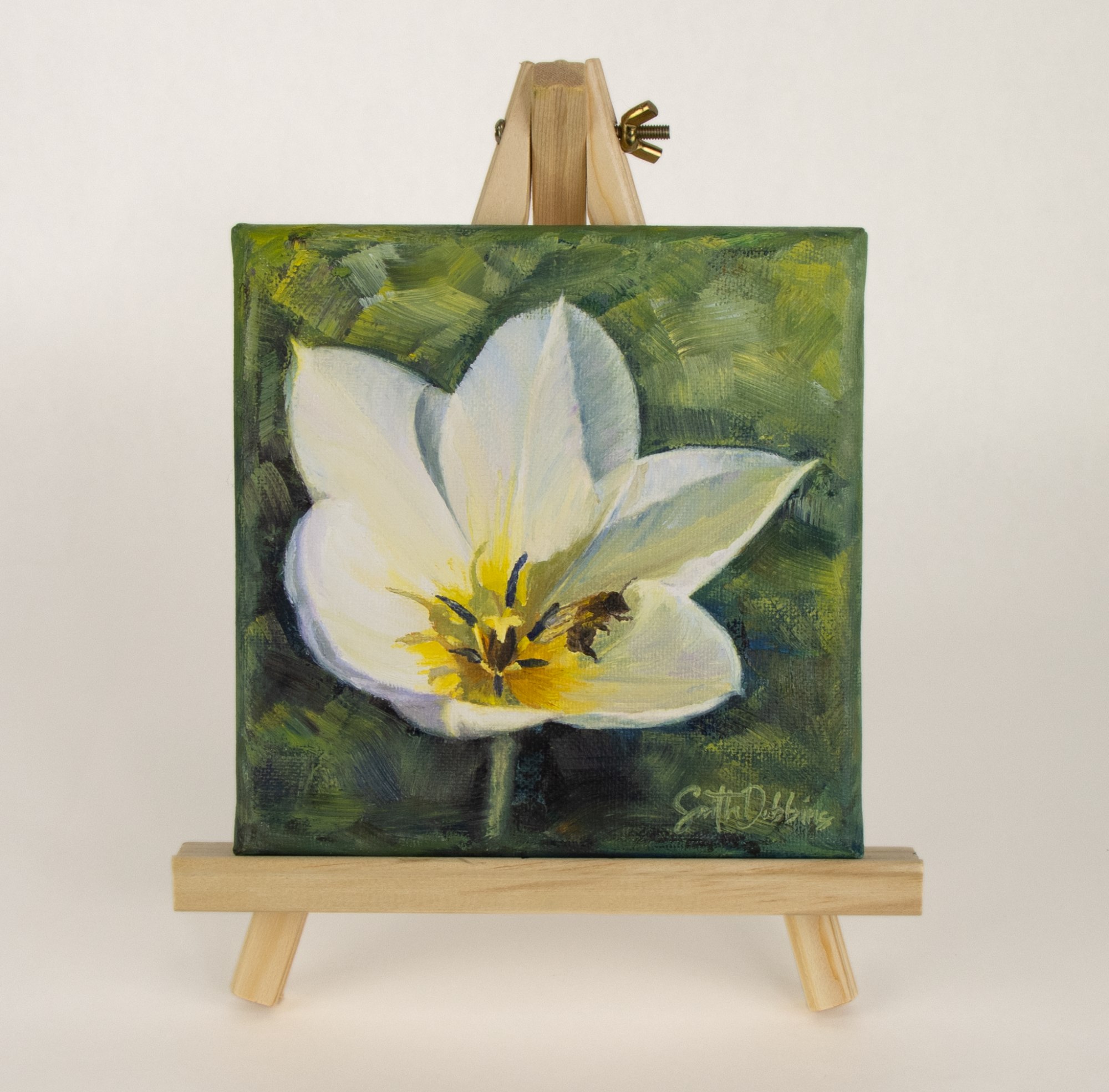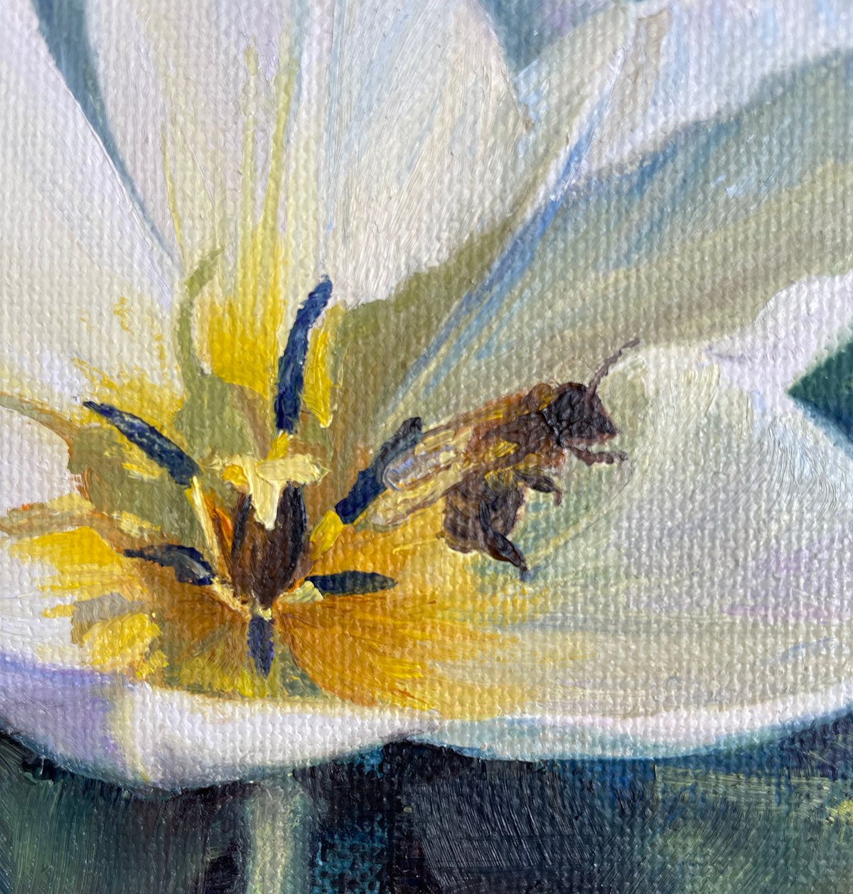 Tulips are my most favorite flower and painting this white one was fun practice painting whites. Whites are never white...they’re blue, purple, green, yellow. And can’t have a tulip without a bee in it.