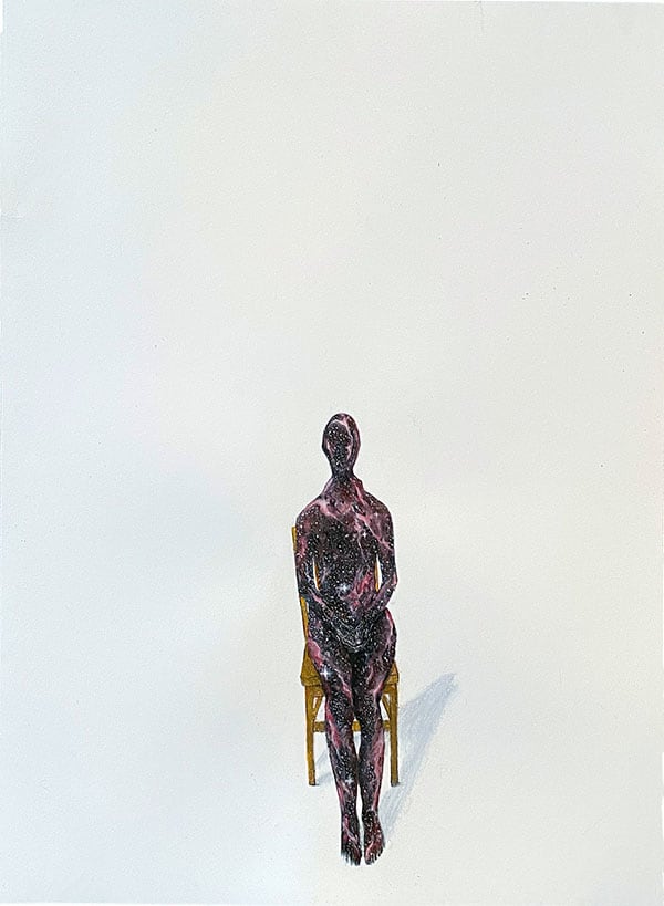 The imagery within the figure of my piece, All Possibilites, was inspired by the Vela Supernova Remnant. Embedded within the shredded cloud of expanding supernova debris lie the remnants of the star that created it, the Vela Pulsar. The pulsar emits a jet of high energy particles 3 trillion miles long and 200 billion miles wide that whips around at half the speed of light, like an untended firehose. For the chair the figure sits on I used gold leaf to remind myself of the value of what we already have, of where we are–not in terms of money, but just in terms of existing.