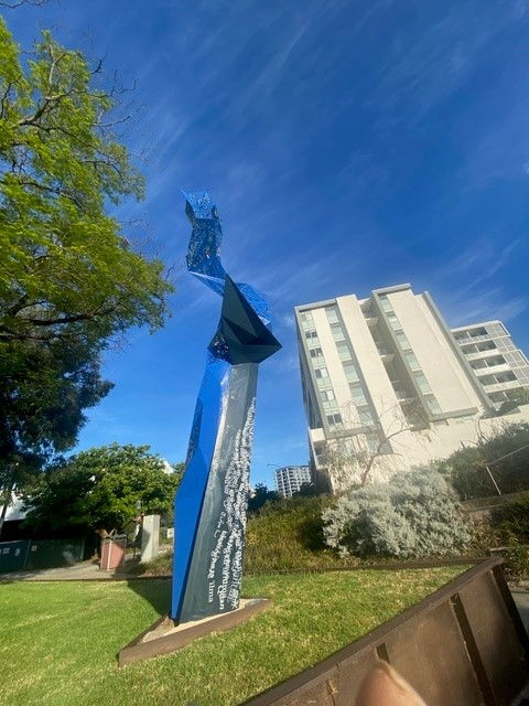 This artwork by Lorenna Grant was commissioned as part of The Springs development in 2012. It is inspired by its proximity to the Swan River, with the sculptural form denoting a movement from ground to air. At the base of the artwork is inscribed 'water spring' in 16 languages.