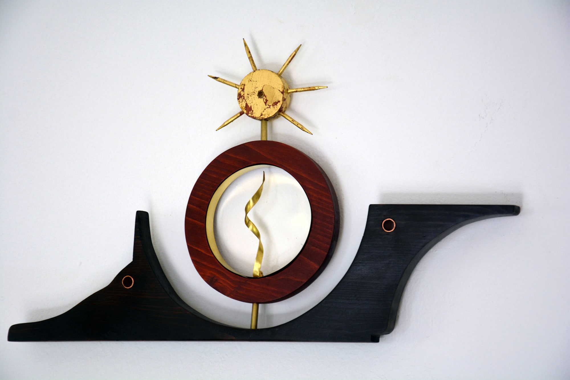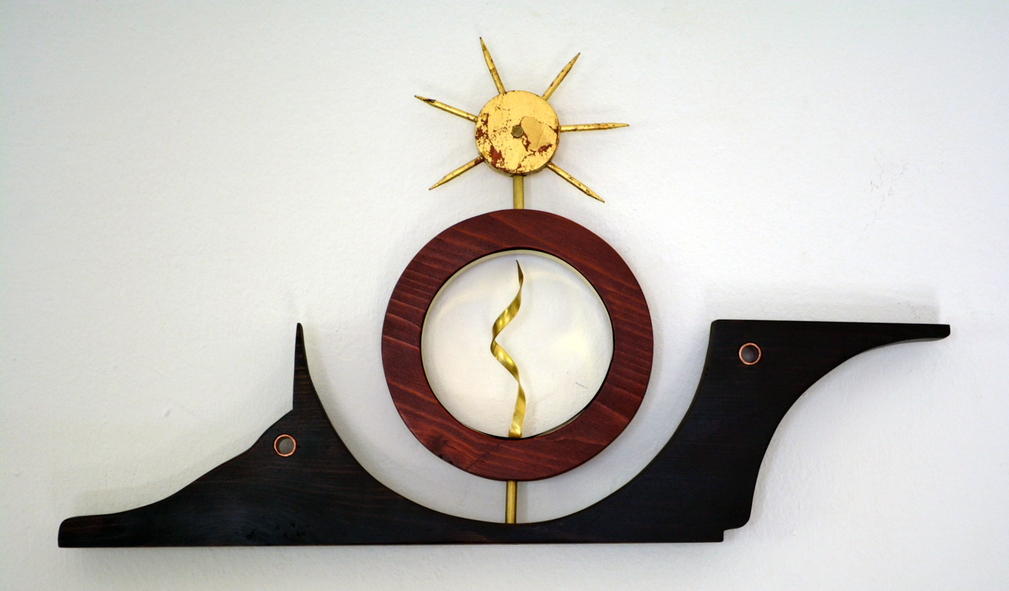 Materials: wood, brass, copper, stain, gold leaf, varnish