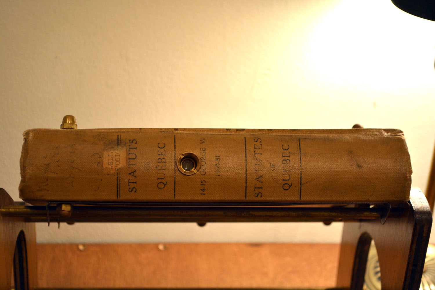 Materials: book (Statuts de Québec 1950-1951), mirrors, judas, found objects, plywood, stain, brass hardware, lamp.