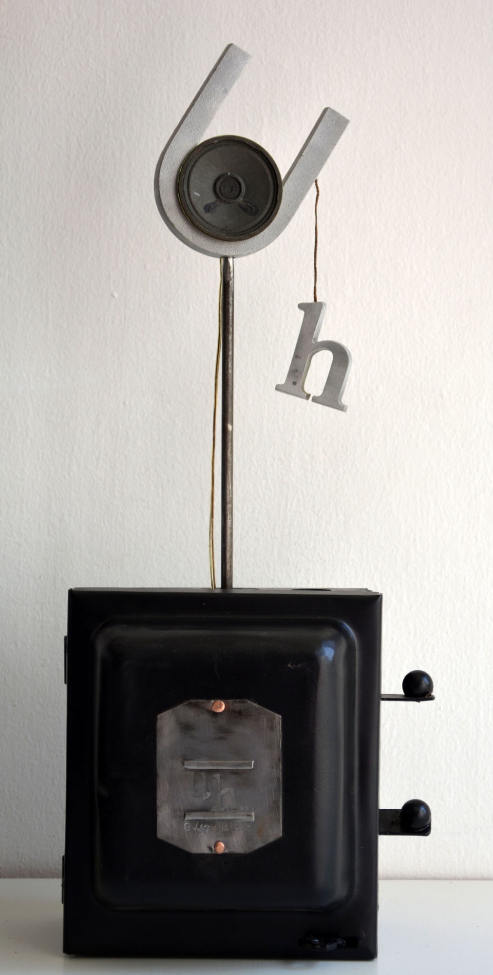 Materials: found objects (aluminum letters, electric box) speaker, speaker wire, steel, braided copper rope, paint, tape player.
