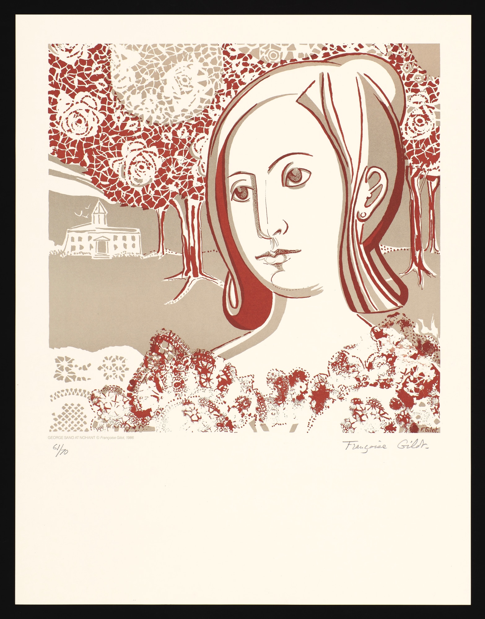 A face of a girl in colors of sage and brown - trees in the background - a white building far off in the distance.