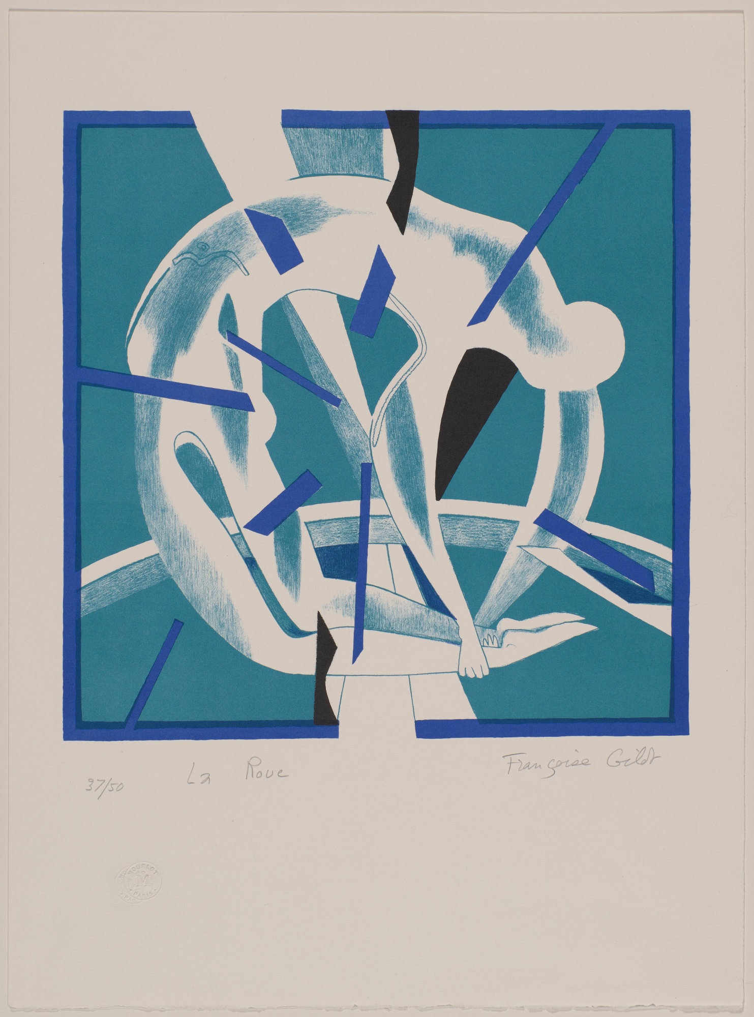 figure in a backward bend forming a wheel pose. Printed in three colors: pale blue, dark blue, and black