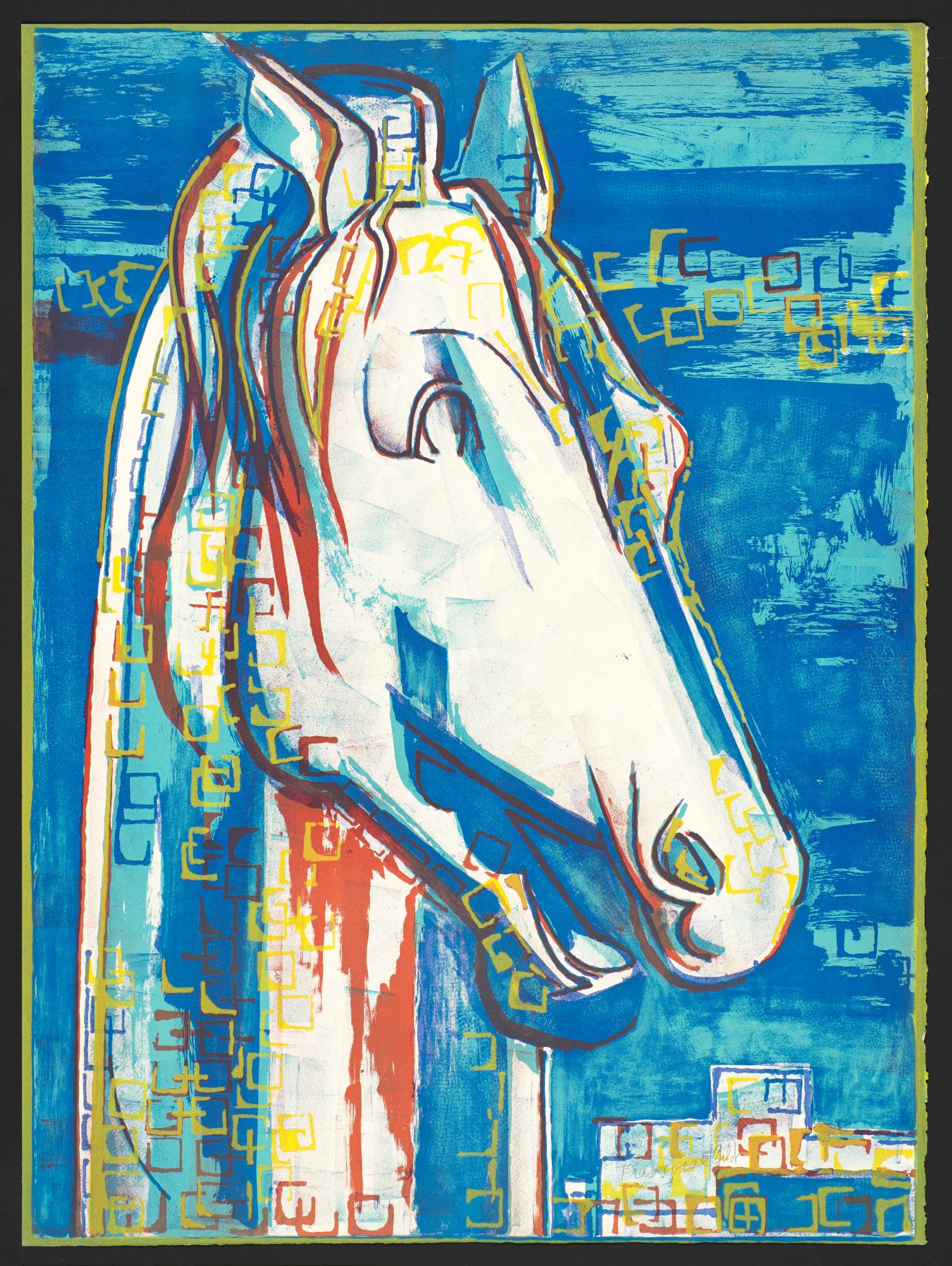 Head of a horse in blue and white tones.