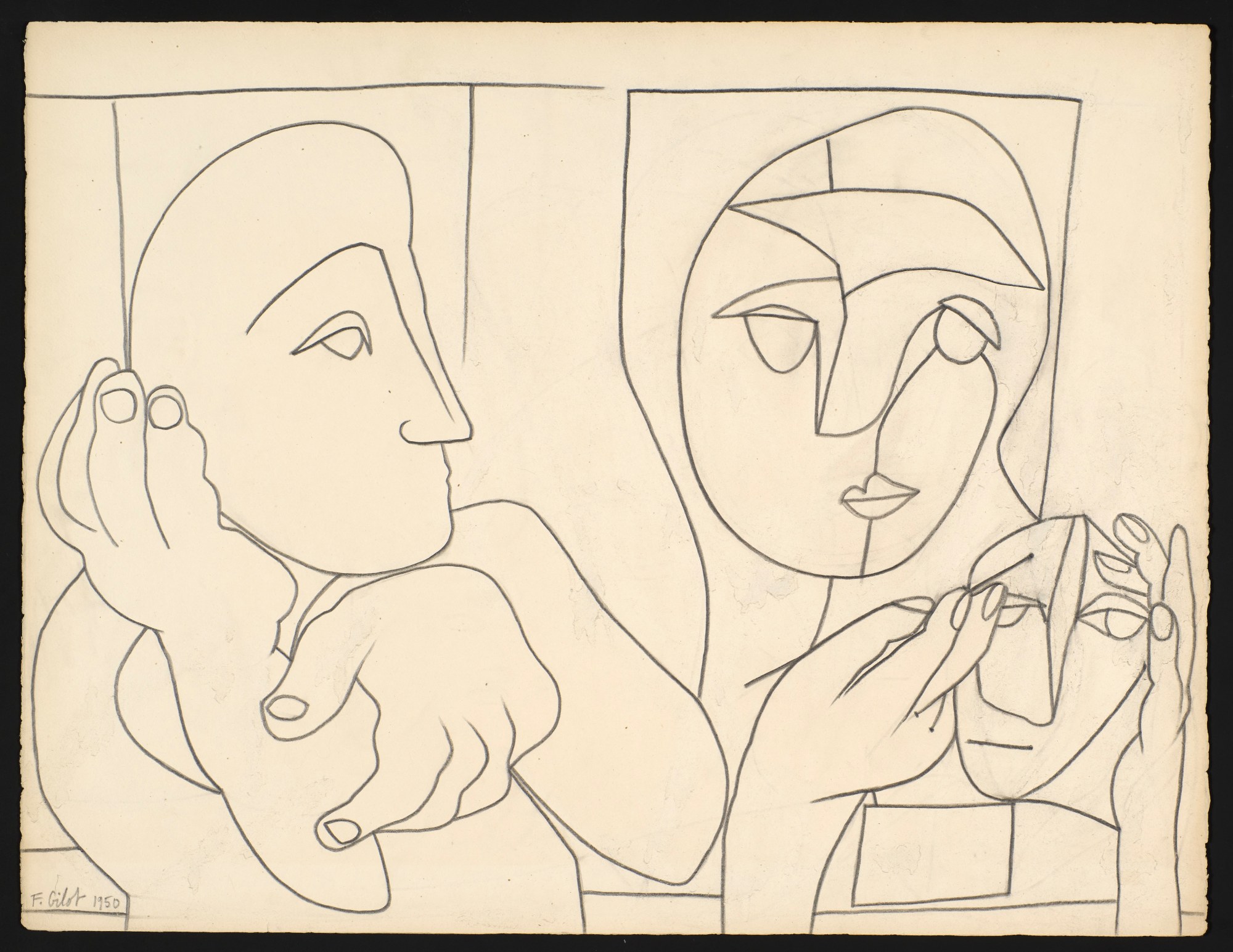 Contour line drawing of two women's faces and hands - woman on the left is in profile, the one on the right is a frontal view.