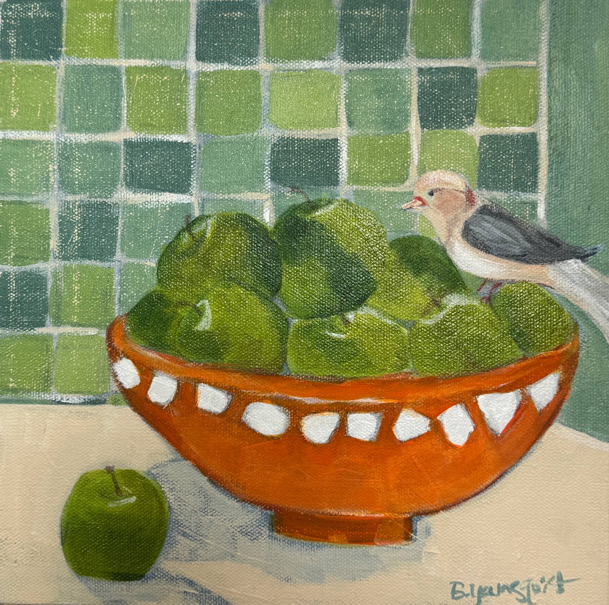 Capture a cozy moment with this charming small still life painting featuring a lively house finch perched near a vibrant orange bowl filled with fresh green apples. This playful domestic scene brings a touch of nature’s whimsy and color to your space, perfect for brightening any room with its cheerful and inviting vibe.