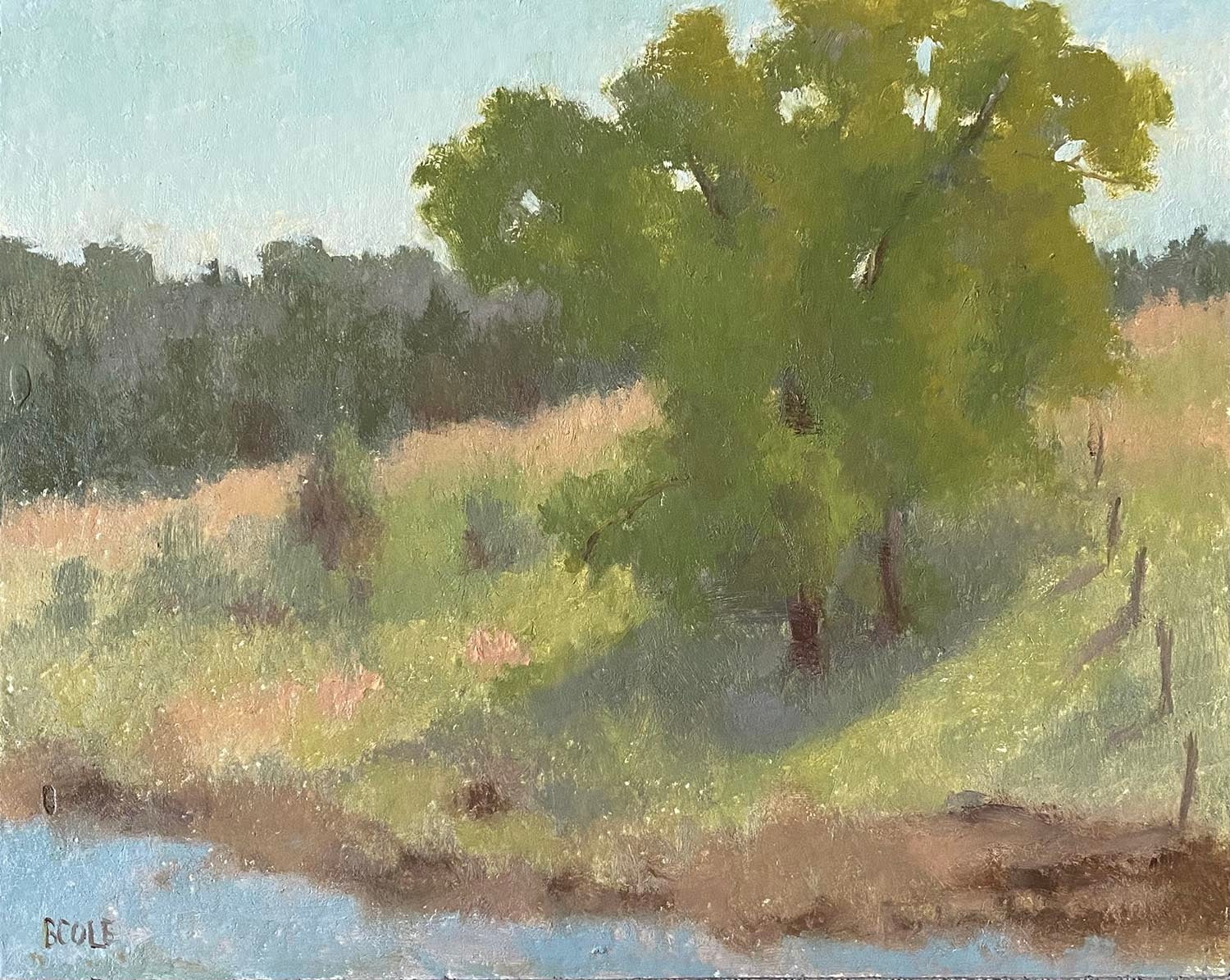 Painted plein air at the Niobrara River at midday. I was struck by the shadows of the tree and the fence line.