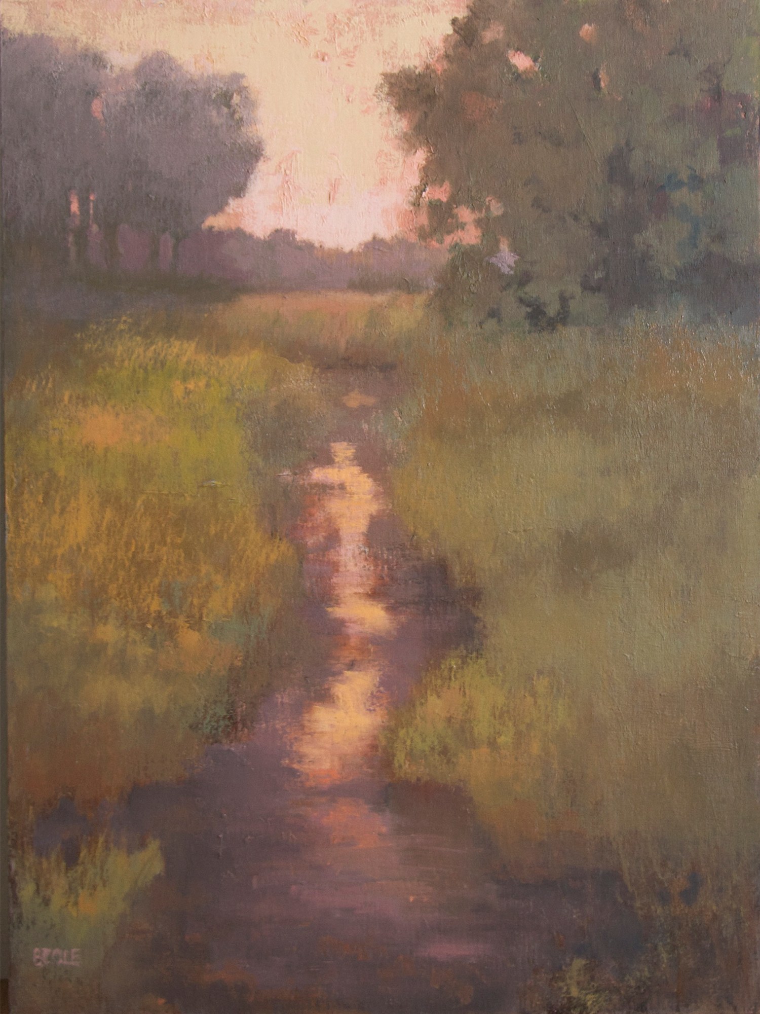 The simplicity of a little creek, glinting in the soft morning light, always sticks in my mind after I see it. This painting is inspired by those glimpses, my paintbrush filling in the blanks from memory.