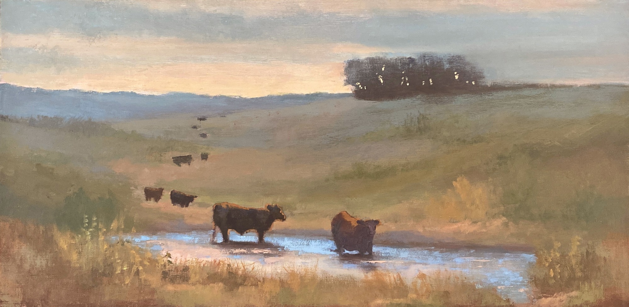 Description: Recently we drove past this glorious pasture pond of shimmering light with a trail of cattle headed toward it. Stop, stop, I said! We backed up and I stared for a good long while and also took a few photos. Most of the cattle were on their way, trailing in a beautiful S curve, but some were already taking a dip. Refreshment!