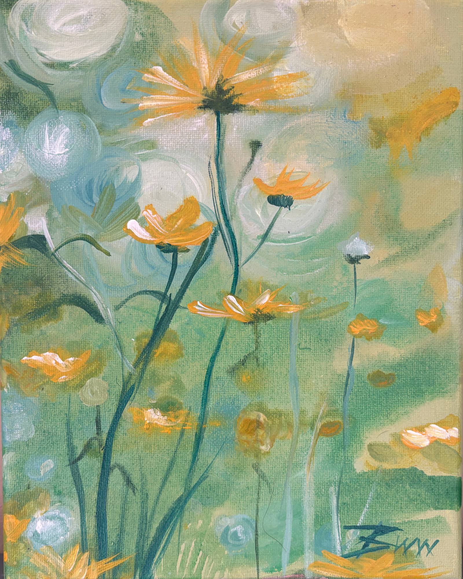 This fun, happy painting of marsh coneflowers was painted from references taken at the home of a local naturalist. His backyard was a sea of rare marsh coneflowers. It began with a wet-on-wet method in acrylic paint and built up to more opaque details in the foreground.