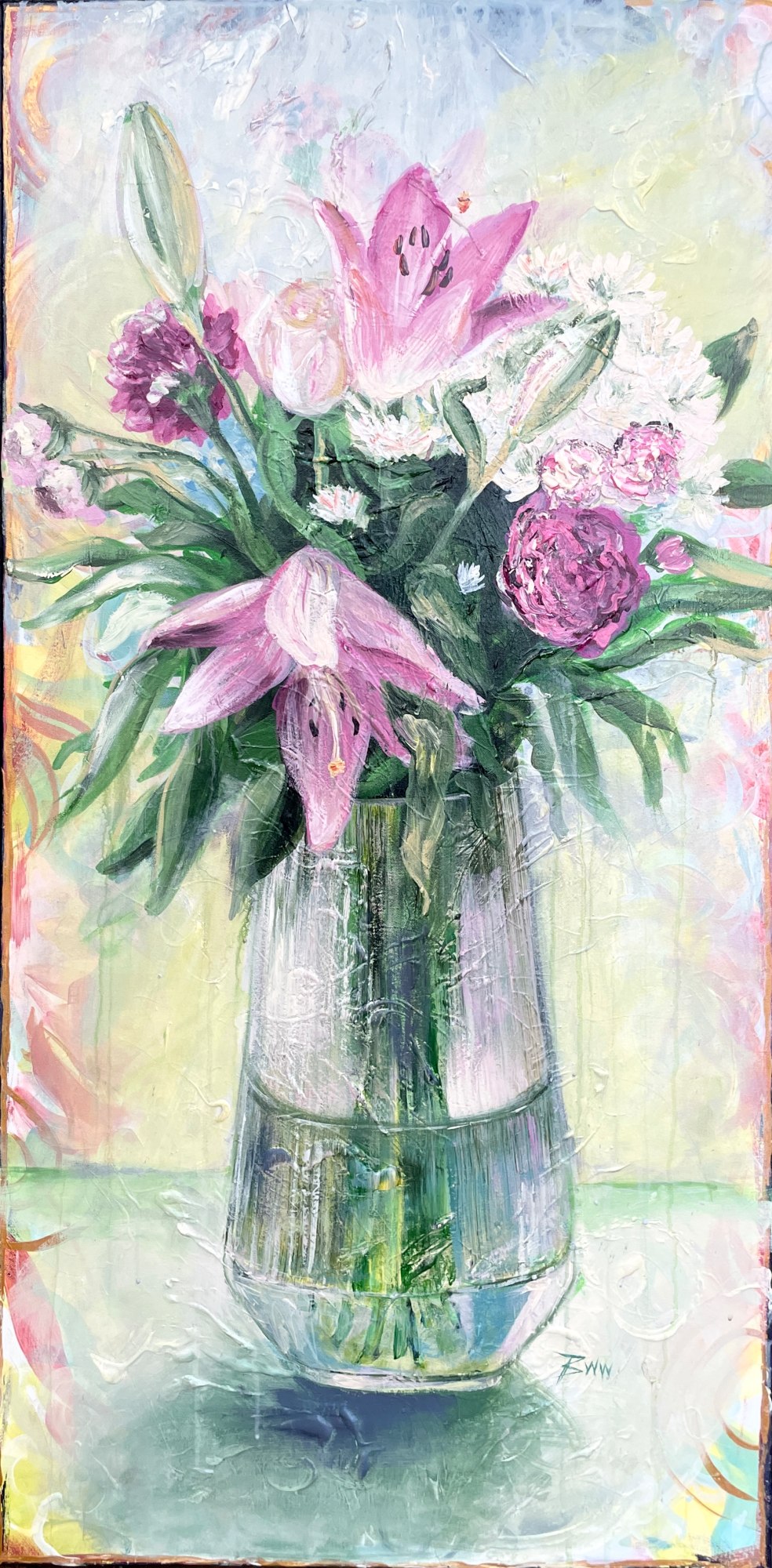 New Beginnings was painted directly from life in my studio, using the bouquet my daughter received at her graduation. I set the flowers over an abstract painting I had been struggling with, and the process led to a surprising and pleasing effect — the underlying colors from the abstract piece created a vibrant, expressive background. This highly textural painting was created on a tall, deep gallery-wrapped canvas with hanging wire and is ready to display.