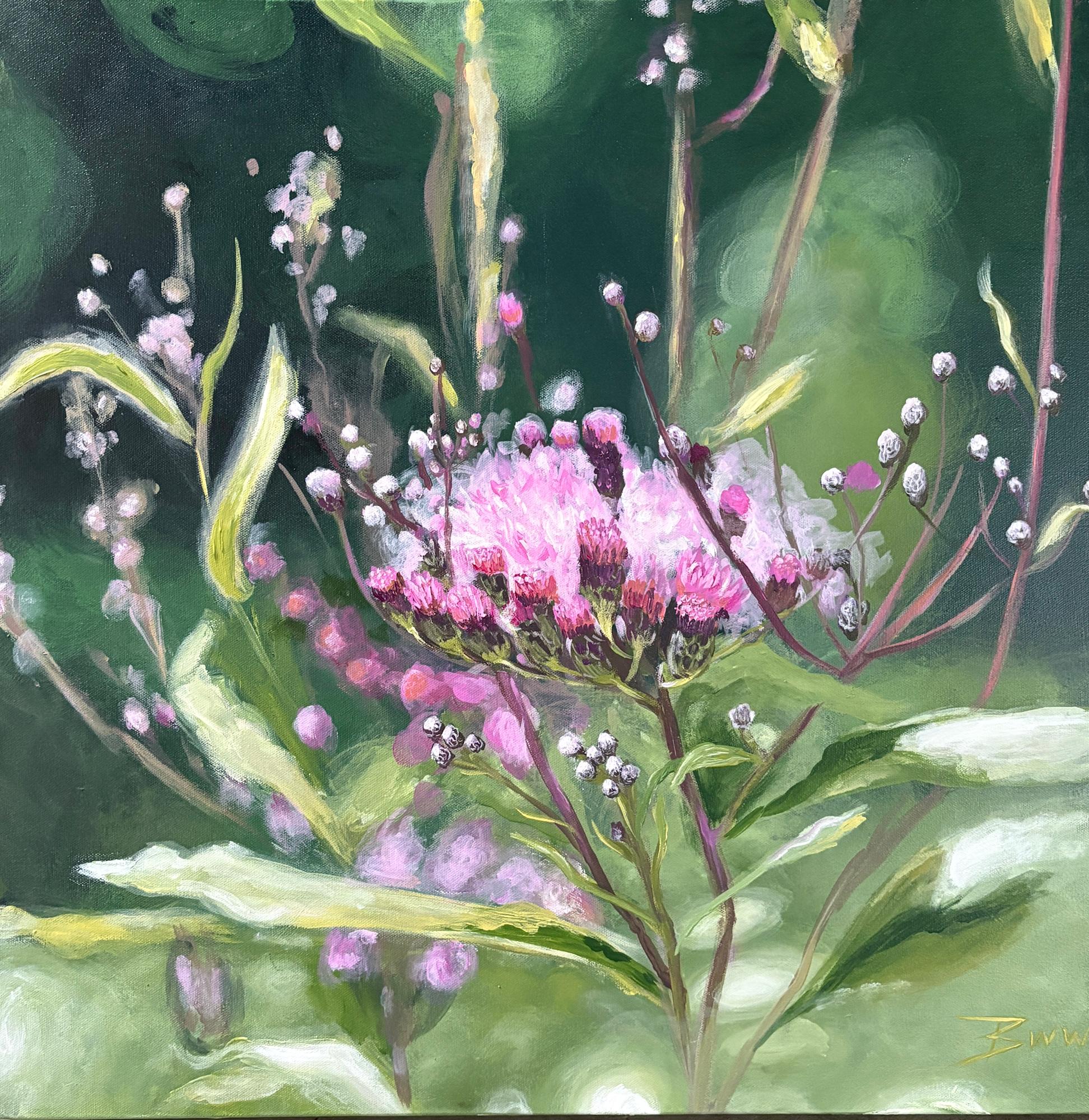 This gorgeous cluster of ironweed blossoms was photographed at the Flint Creek Meadow in Hartselle, Alabama - North Alabama's first public grassland remnant. If you would like to enjoy this public meadow, look for it along Highway 31 near the boat ramp. Ironweed is a late summer, early fall wildflower that meets the nectar needs of many pollinators late in the season before the cold weather sets in. Named for its rigid, iron-like stems, this plant has special meaning to me, as some regard it as a symbol of grit or overcoming adversity. It is my own version of a steel magnolia.