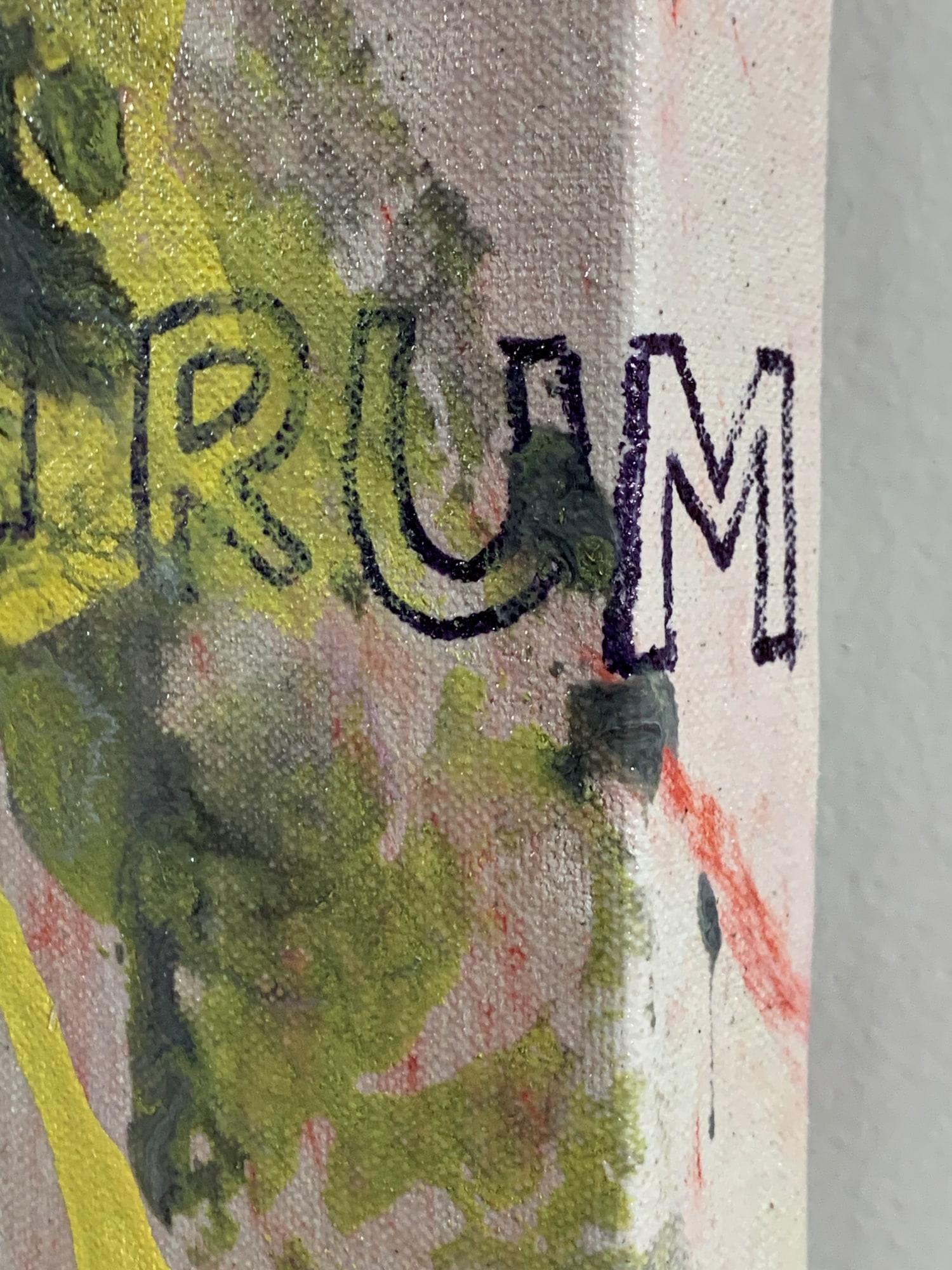 This was one of those paintings where the first half was so good that it scared me a little bit and the painting sat half finished on the work table for a couple weeks because I knew it was good and wasn't sure how to finish it. It was that series of bold red paint smears in the middle layers that did it. They were just so cool and imposing when they were on the surface, I wasn't sure for a while that anything should go on top of them.