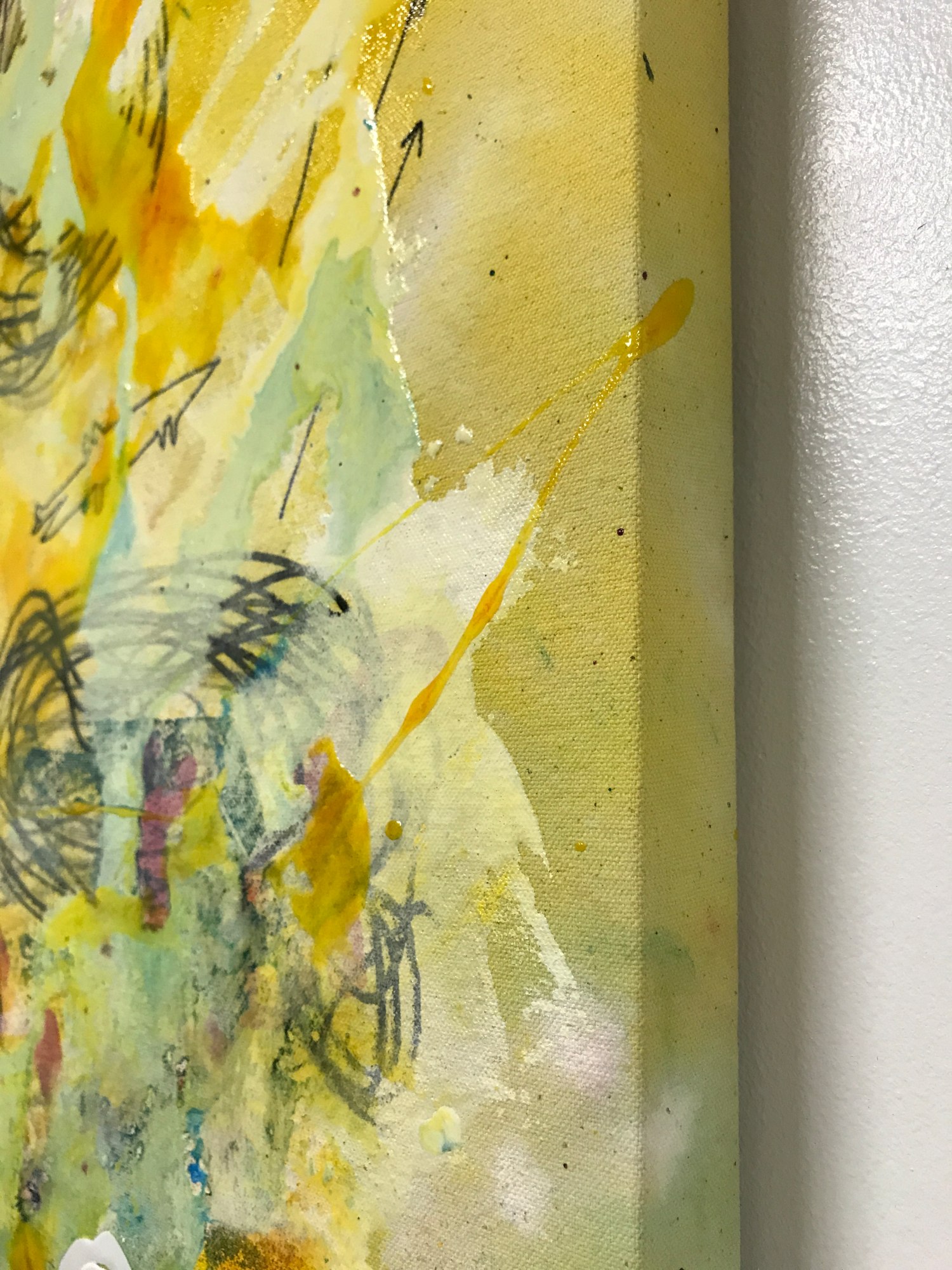Then we get into the poured paint. It's a lot of yellow and white mixed into an acrylic pouring medium and poured directly onto the canvas, then pushed around with a silicone wedge tool. There's a bit of blue mixed to green, and a bit of magenta, but the painting is overwhelmingly yellow. The black and white circles come last. These are made by dripping fluid acrylic in black and white into pools of wet acrylic pouring medium.