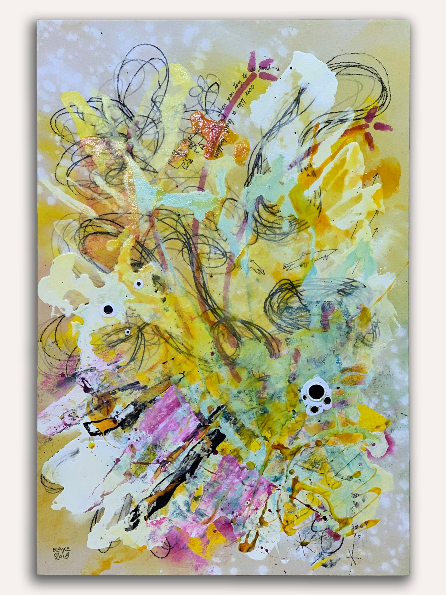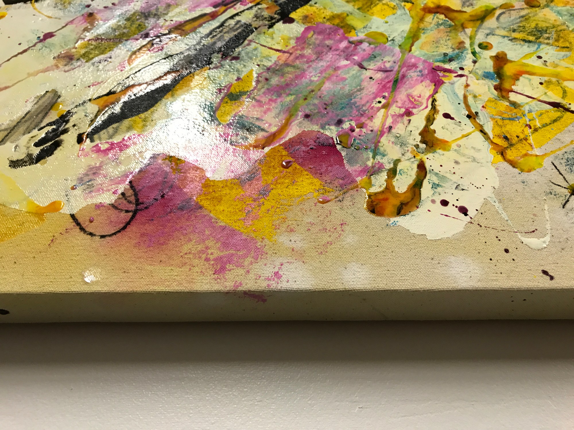 This is an original painting in acrylic and marker on un-primed gallery wrapped canvas. I like working on un-primed canvas because of the neutral background it provides. It's always possible to add white where you want it, like the splotches of white in the upper left and lower right. It is a layered composition which the different layers interacting and informing each other.