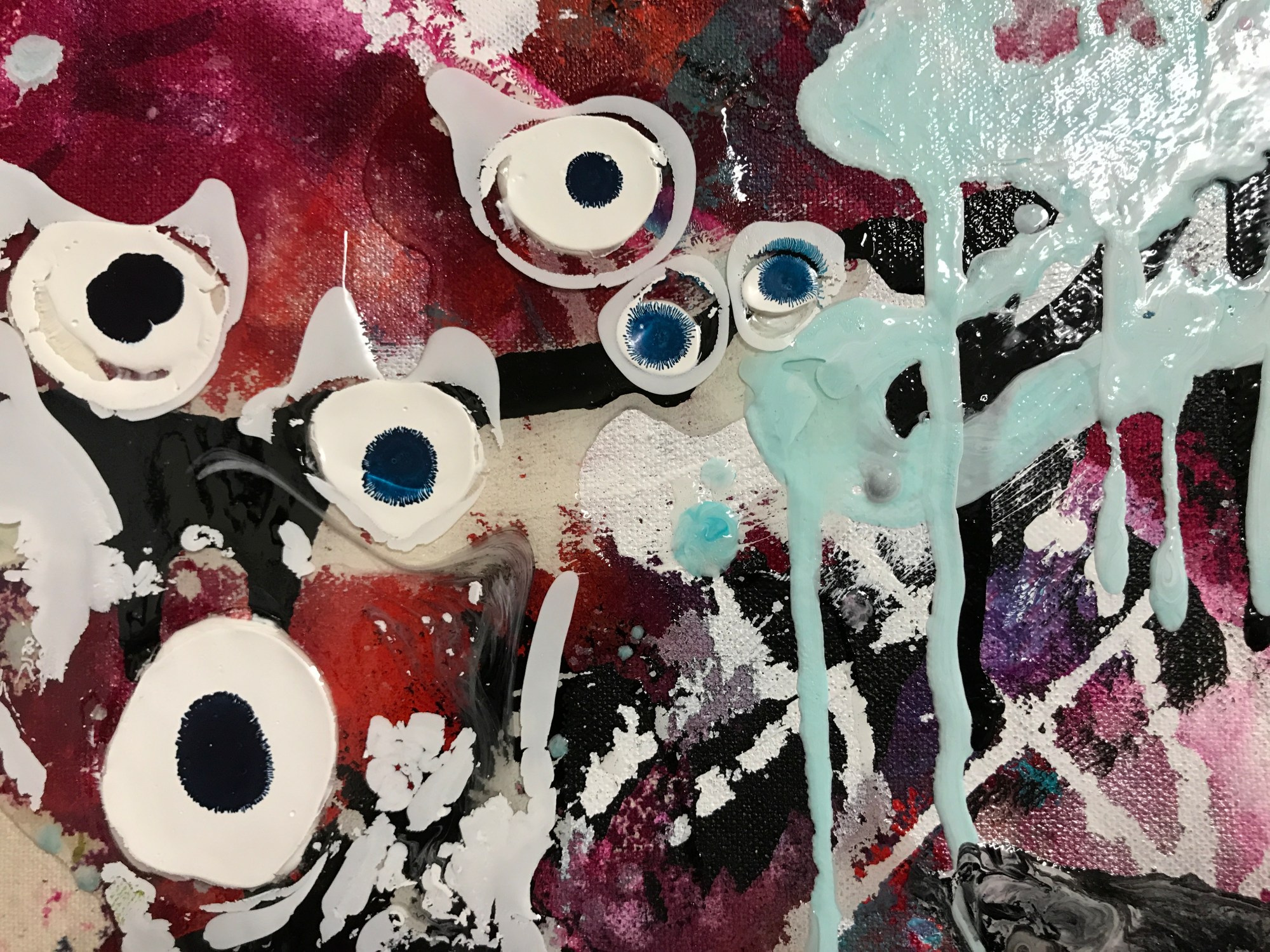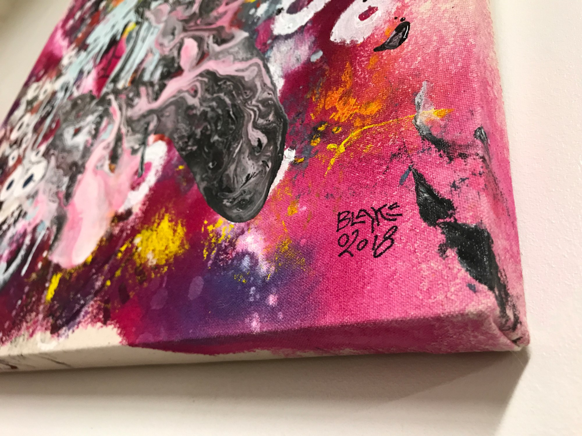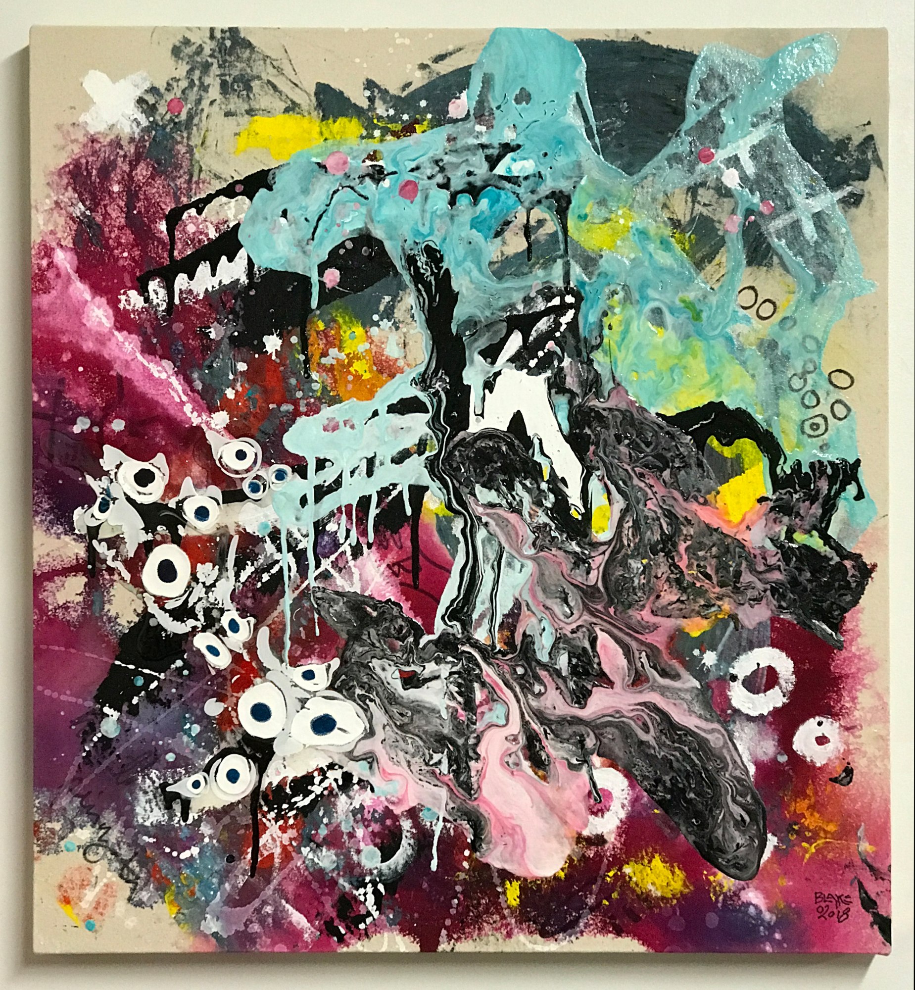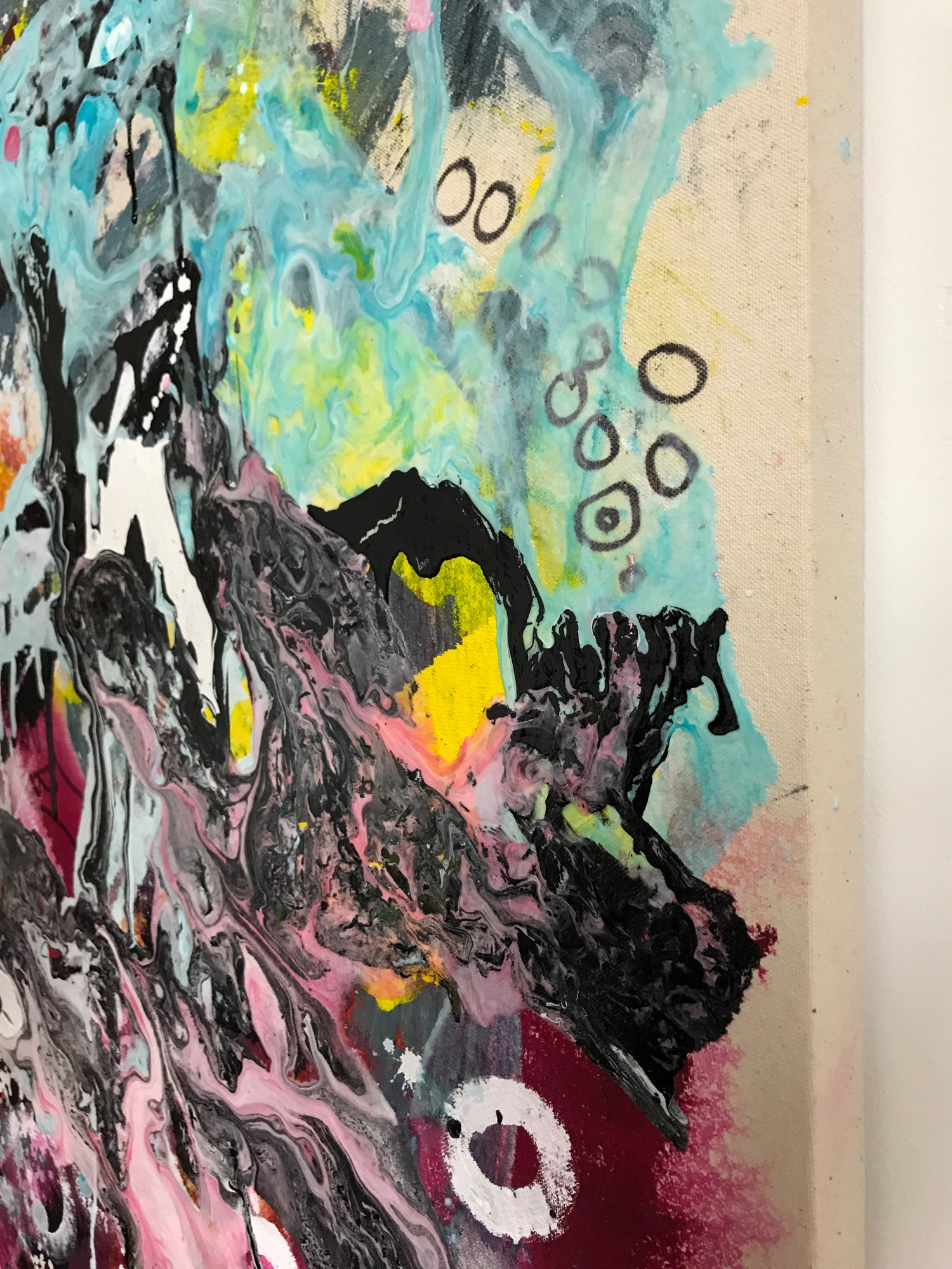 There is a vortex of activity in this piece, with an underlying composition of delicate gradients in pink, yellow, and blue created by applying low viscosity (high flow) acrylic paint to canvas that has been soaked in water. The water pulls the paints into the fibers of the canvas, resulting in a dyed effect. On top of this I have poured, dripped, and smeared various acrylic paints and doodled in sharpie marker.