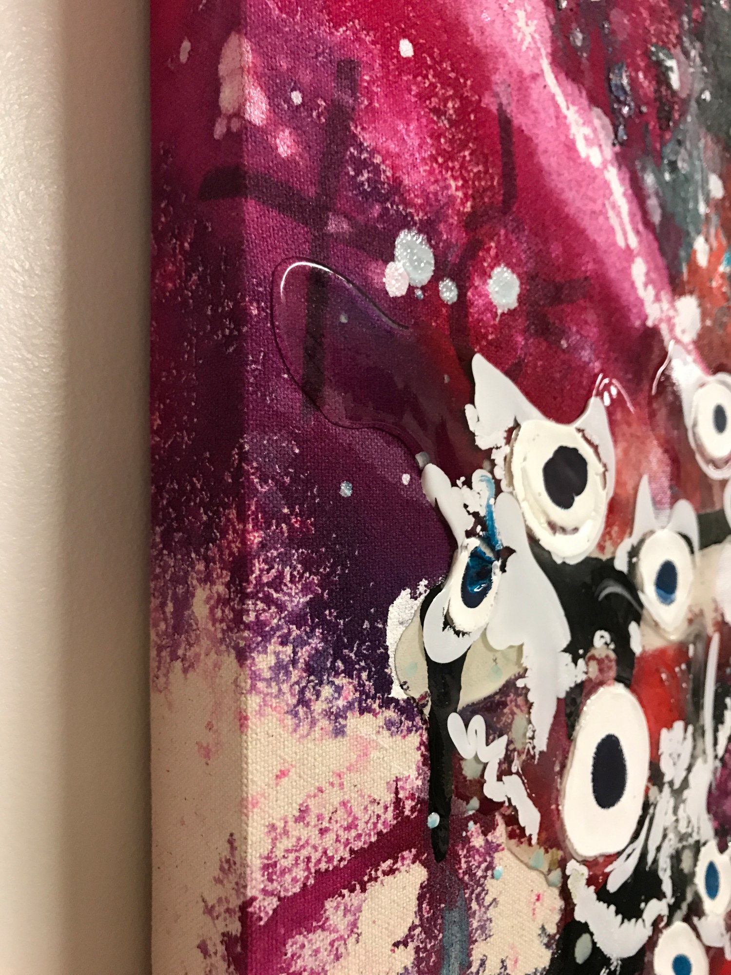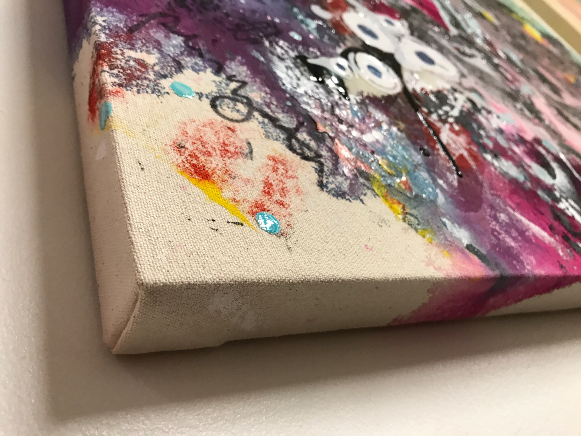 This is an abstract painting on un-primed (raw) canvas in acrylic with indelible marker (Sharpie), paint marker, and collage. The painting was wrapped around heavy duty gallery depth (1.5”) stretcher bars after it had dried, such that elements of the composition wrap around the sides of the final piece (see detail image).